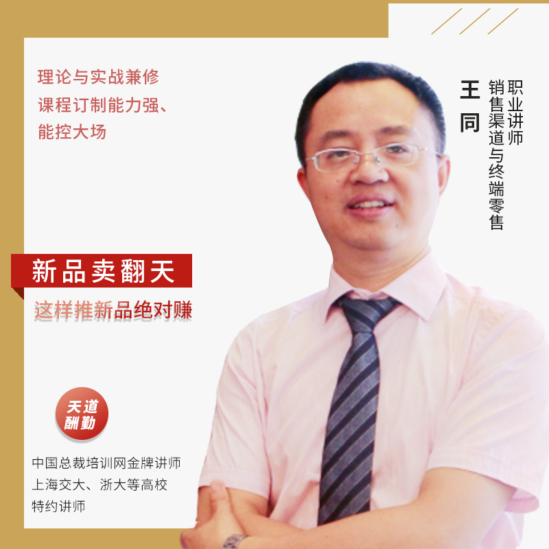 王同 【行业背景】销售渠道与终端零售职业讲师;中国总裁培训网金牌讲师;上海交大、浙大等高校特约讲师;【职业经历】理论与实战兼修:中国人民大学02届MBA,曾服务华润雪花啤酒6年,咨询培训12年。王同老师一直活跃在培训领域,已服务过蒙牛、恒安、美的、九阳、欧莱雅、劲霸、惠达等数百家的企业内训。经销商大会主讲老师、课程订制能力强、能控大场、轮训项目主讲老师、数百家内训客户以及众多回训客户的见证。