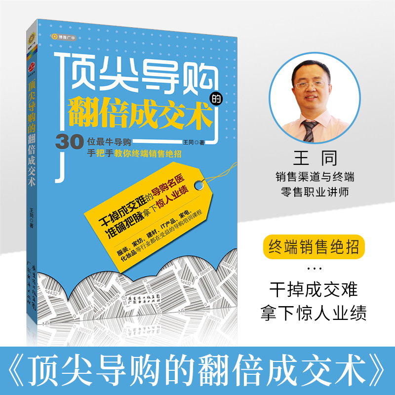 《顶尖导购的翻倍成交术》编著者王同。 热销终端培训图书《顶尖导购这样做》全新升级,更新案例,更多技巧干掉成交难的导购名医,准确把脉拿下惊人业绩服装、家纺、建材、IT产品、家电、化妆品等行业都在受益的导购培训课程顶尖导购的秘诀在于善于成交。同样的产品、同一家店铺,有的导购能在一天轻松卖出几十件,而有的导购费尽口舌、跑前跑后却怎么也卖不出。 怎样让“随便看看”的顾客找到需求?怎样让“货比三家”的顾客马上下单?怎样让狠狠砍价的顾客不再斤斤计较?怎样让无端退货的顾客满意而归?……“导购名医”王同汇集了终端销售中每天都会遇到的难题,通过对顾客心理的精准把脉,找到成交难的症结所在,让一线导购迅速掌握翻倍成交的绝招,消灭“零成交”,创造骄人业绩。 升级版增补了行业案例和自测题,更有针对性、实战性,是一本随看随用的导购实用手册。