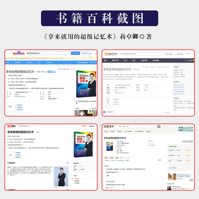 本书舞台上选手们令人望尘莫及的震撼表演,其背后到底是惊人的天赋还是后天训练的成果?翻开这本书你就可以找到答案!本书对记忆学领域中核心的训练内容进行了详细讲解,包括连锁故事法、图像定位法、数字密码、记忆宫殿等,并对各种记忆术在生活中的具体运用也作了举例说明,甚至还有世界脑力锦标赛的训练内幕和本书的幕后故事。作者通过他的亲身实践,以□实的语言,将大师们神乎其技的高难记忆技巧深入浅出地娓娓道来,为读者打造了一套自我训练、自我提高的实战技法,数以万计的教学案例证明这套方法简洁而有效!只要按照世界记忆冠军蒋卓鎯老师的悉心指导勤加练习,你一定能成为拥有强大脑的记忆高手。