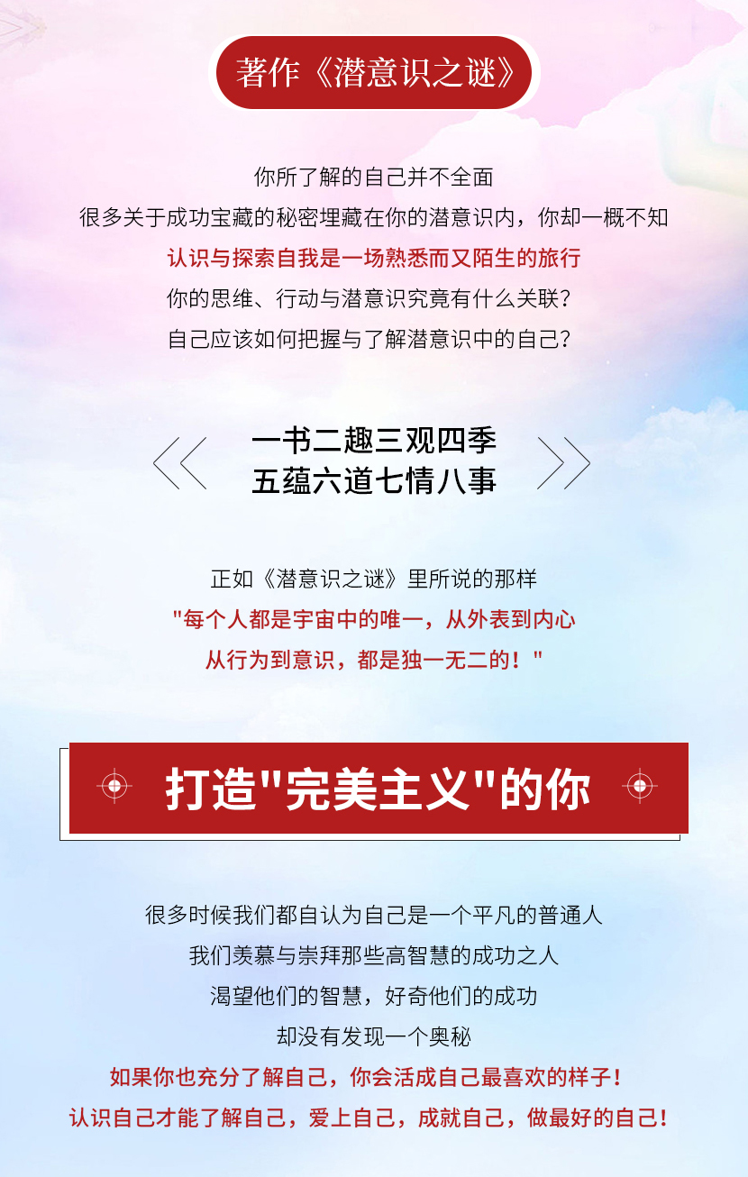 《潜意识之谜》在这里你会认识与邂逅一个个自己,你会发现成功的你、遇见完美的你以及感受真实的你,仿佛从一个世界跨越到另一个世界,从经历到梦想,从遇到到了解,发现潜意识的宝藏,发现自己。