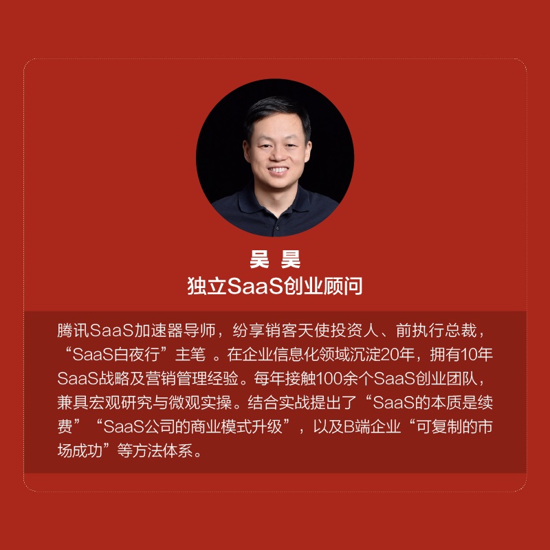 担任多家知名 SaaS 公司战略顾问;腾讯 SaaS 加速器导师;纷享销客天使投资人、前执行总裁,纷享千人营销团队创建者;华为高级合作经理+CEG(采购专家团)+BMT 委员