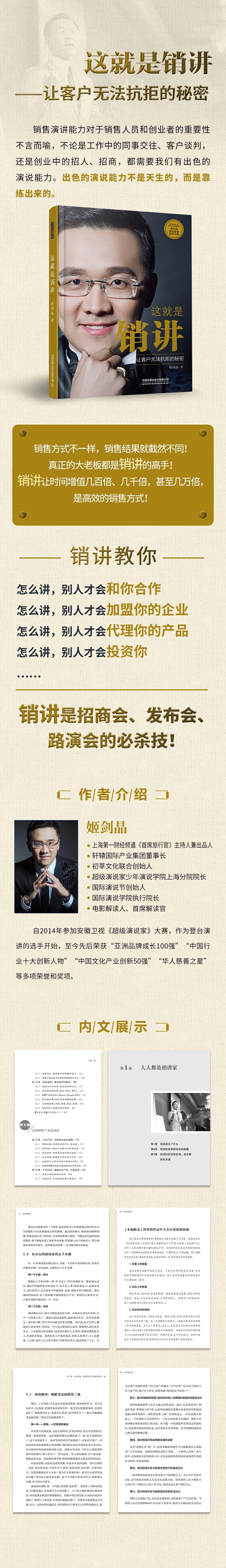 姬剑晶:《这就是销讲》——本书立足销讲,多侧面、多角度、多层次地阐述了销讲的各个关键,先介绍销讲的重要性,其次叙述了销讲前的准备,然后讲述销讲现场如何实现加分、如何巧妙提问、如何提高演讲效率,再后写出了让客户无法抗拒的技巧,后深入剖析了成交的秘密,旨在帮助读者掌握销讲技巧,提升销讲水平,实现成交。