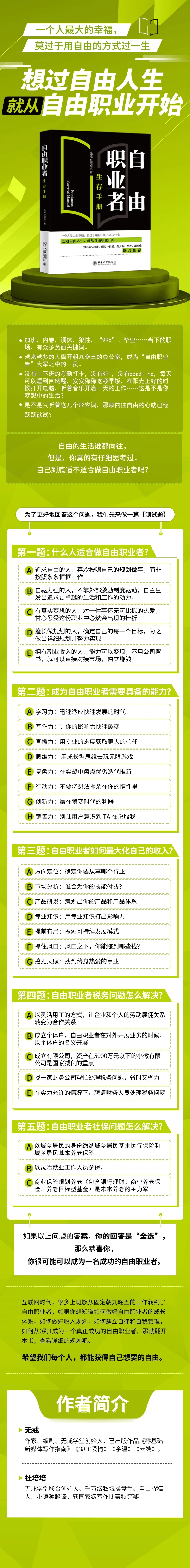 无戒:《自由职业者生存手册》——本书详细讲解什么人适合做自由职业者、自由职业者路上的陷阱有哪些、成为自由职业者需要具备的能力、自由职业者如何找到持续的利润模式、如何实现被动收入、自由职业者税务、保险问题怎么解决等问题。