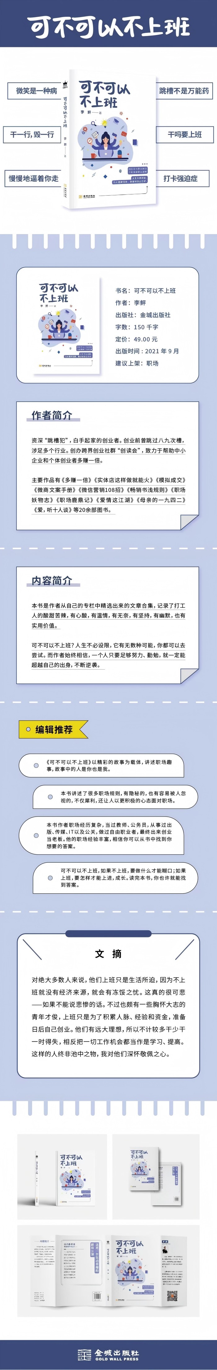 李鲆:《可不可以不上班》本书讲述了很多职场规则,有隐秘的,也有容易被人忽视的,不仅犀利,还让人以更积极的心态面对职场