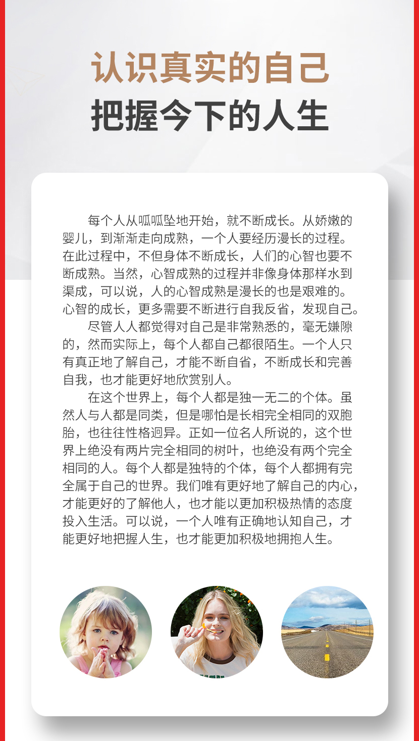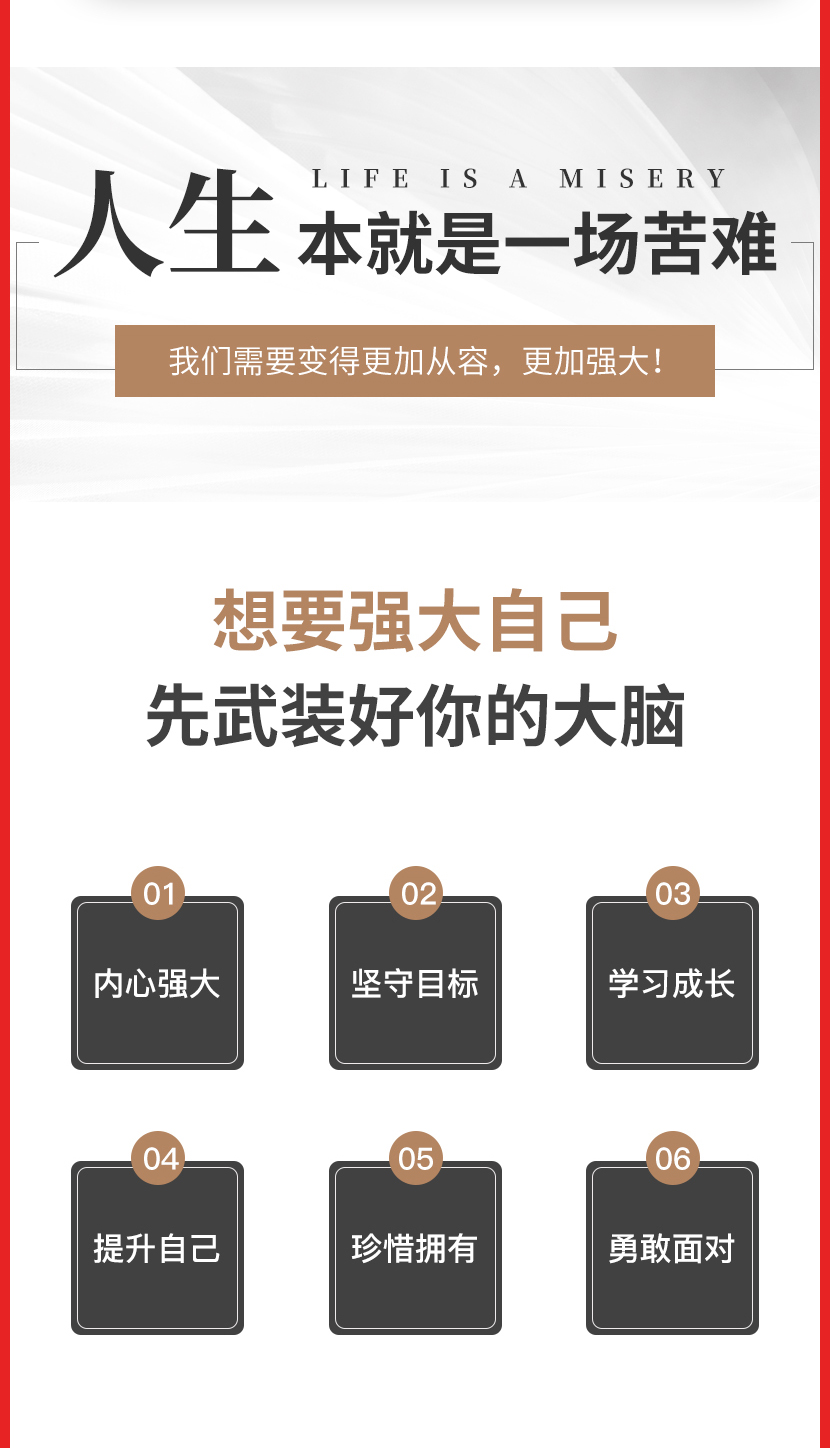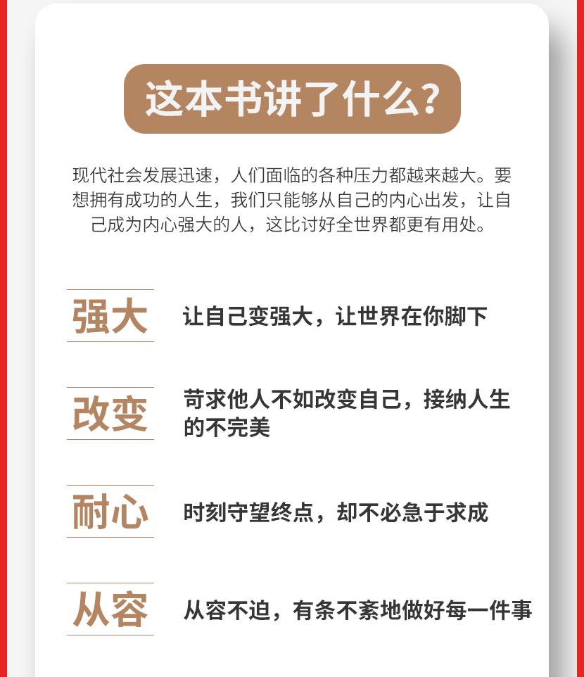 《与其讨好全世界,不如强大你自己》现代社会发展迅速,人们面临的各种压力都越来越大。要想拥有成功的人生,我们只能够从自己的内心出发,让自己成为内心强大的人,这比讨好全世界都更有用处。