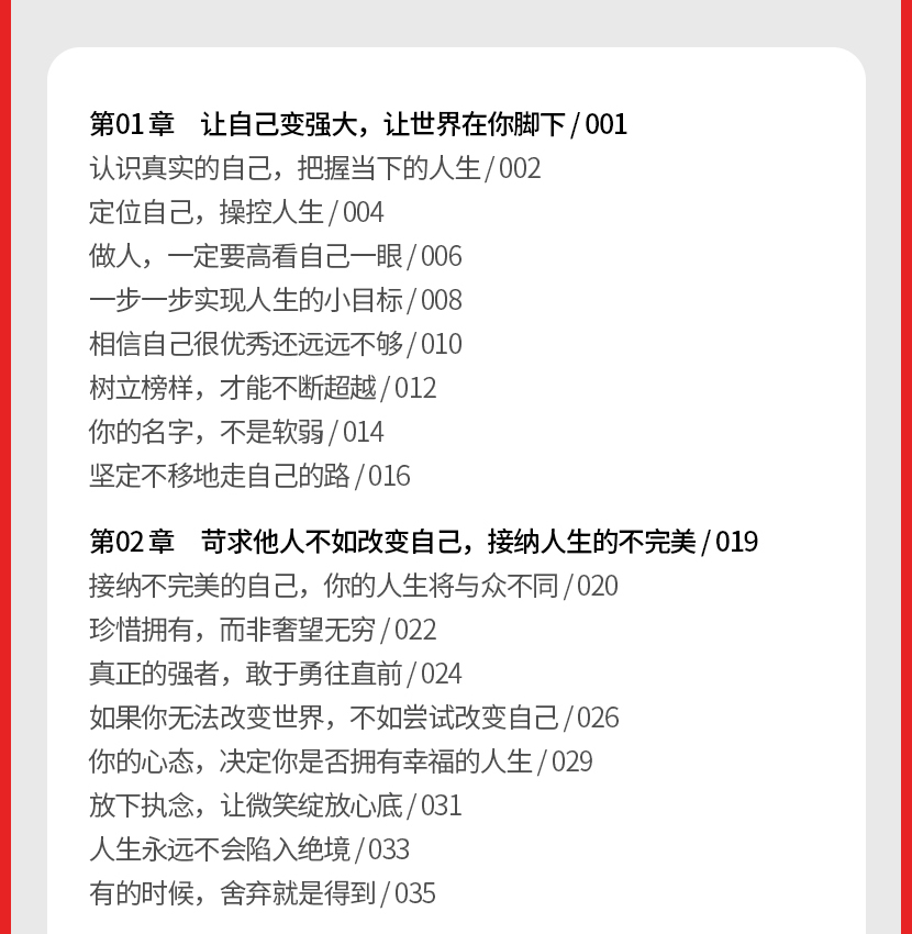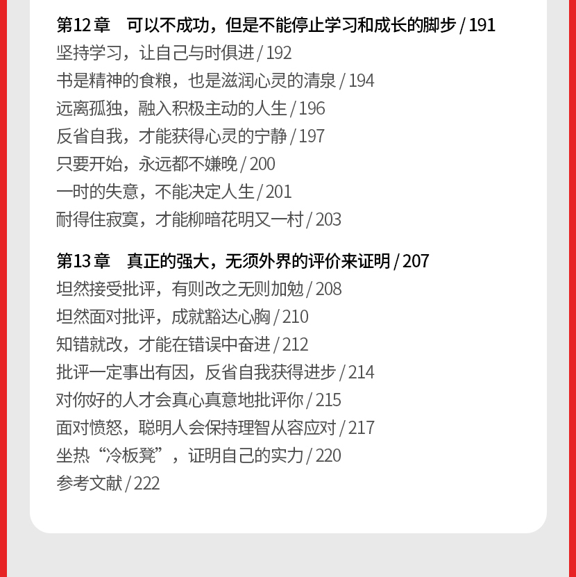 这本书一共分为13章,220页,体量不是特别大。我用了两天左右,把这本书读完。感觉自己进行了一场心灵的SPA,从情绪上到精神上都得到了激励和按摩。这是一本这样的书,当你读起来的时候像是受到长者谆谆教诲,当你觉得脆弱的时候,里面有很多名人故事,可以让你知道别人也会遇到这些事情,连最有名的人也不能避免这种人生的困境。而书中传递的思想和方法,是用简单易懂的心理学知识,调节你的情绪和对事情的反应,从而能让你用积极的态度来面对事情的变化。作为一本休闲读物,这本书可以说是再适合不过了!