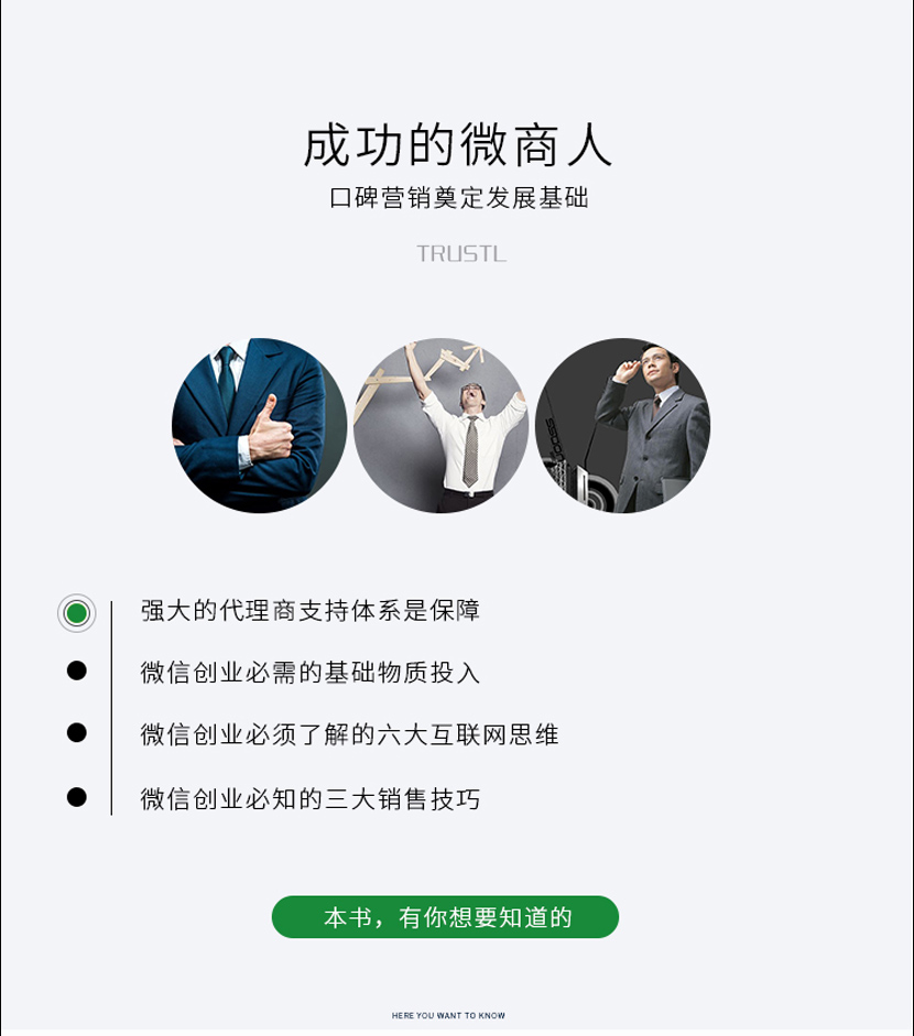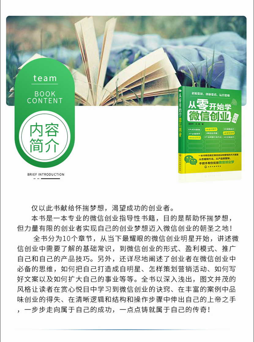 :《从零开始学微信创业》以深入浅出,图文并茂的风格让读者在赏心悦目中学习到创业的诀窍,在丰富的案例中品味创业的得失,鼓励创业者勇敢越自己,一步步走向属于自己的成功。