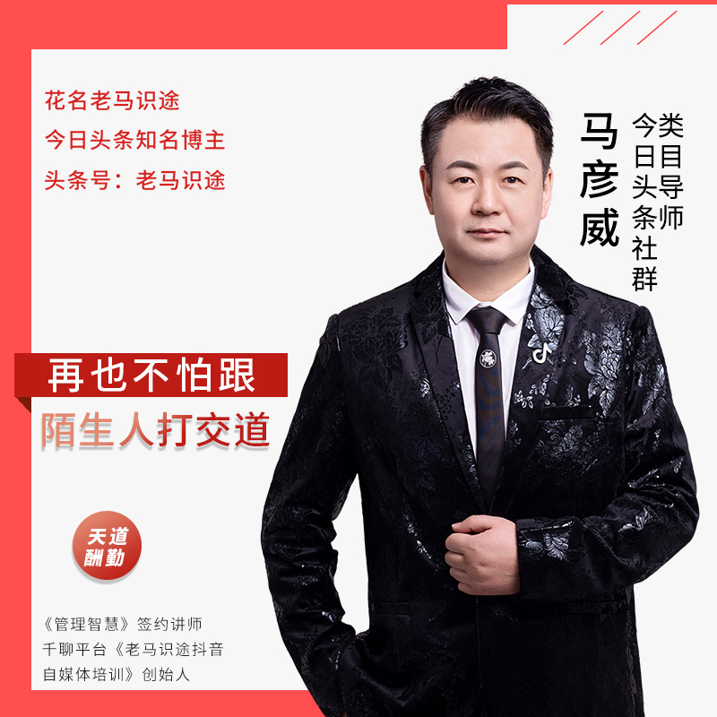 今日头条社群类目导师; 《管理智慧》签约讲师; 千聊平台《老马识途抖音自媒体培训》创始人; 《再也不怕跟陌生人打交道》作者。