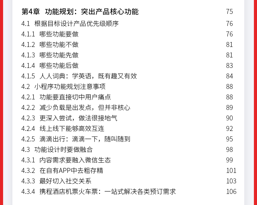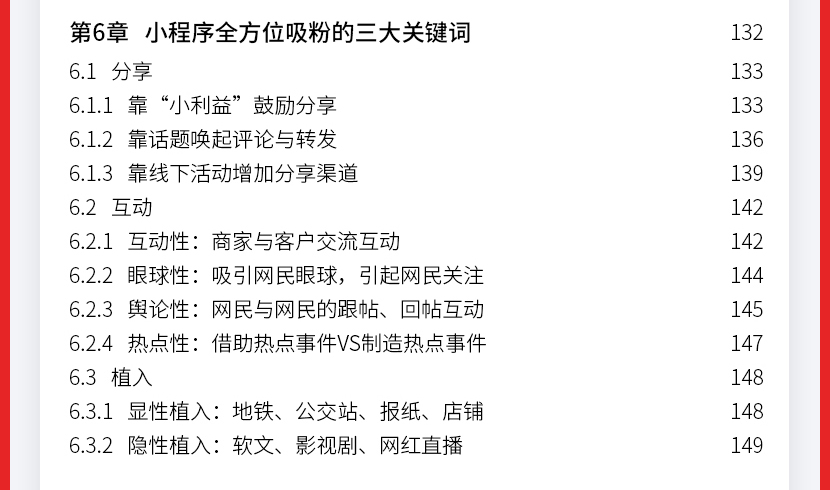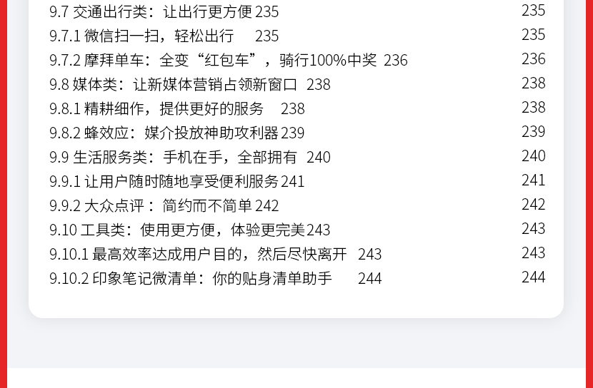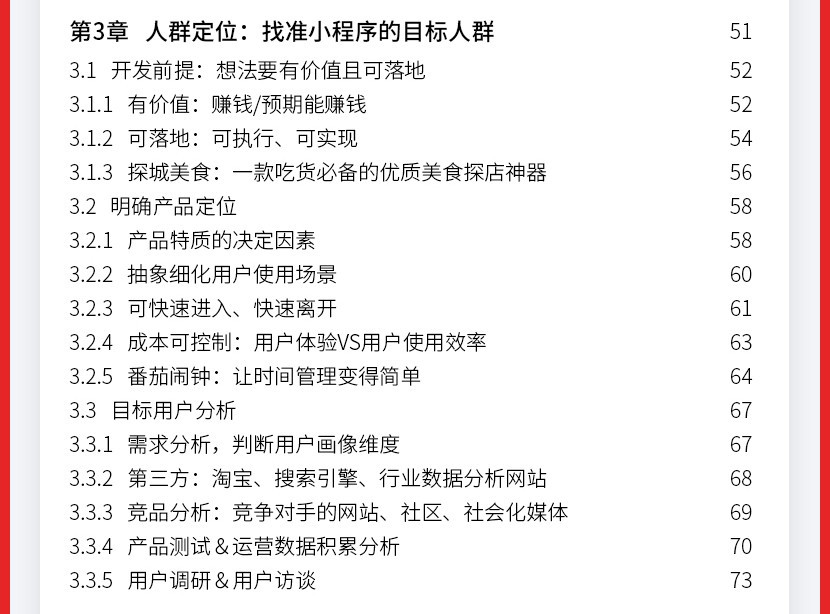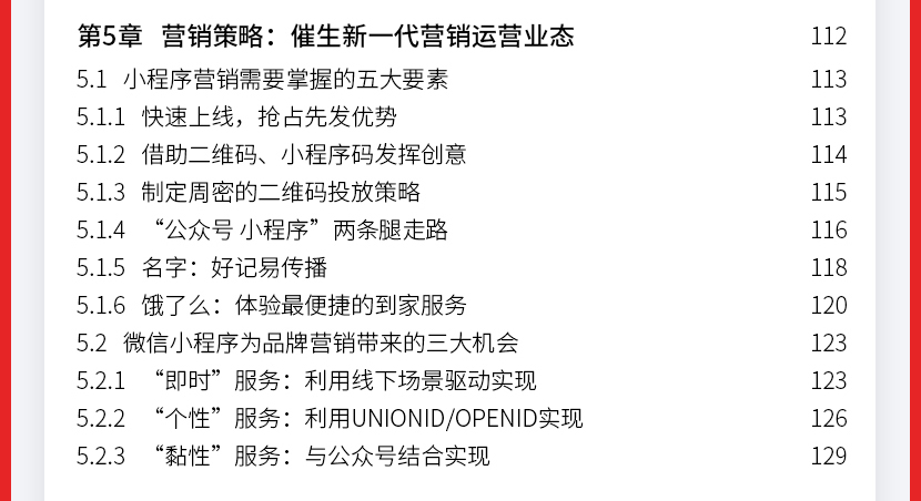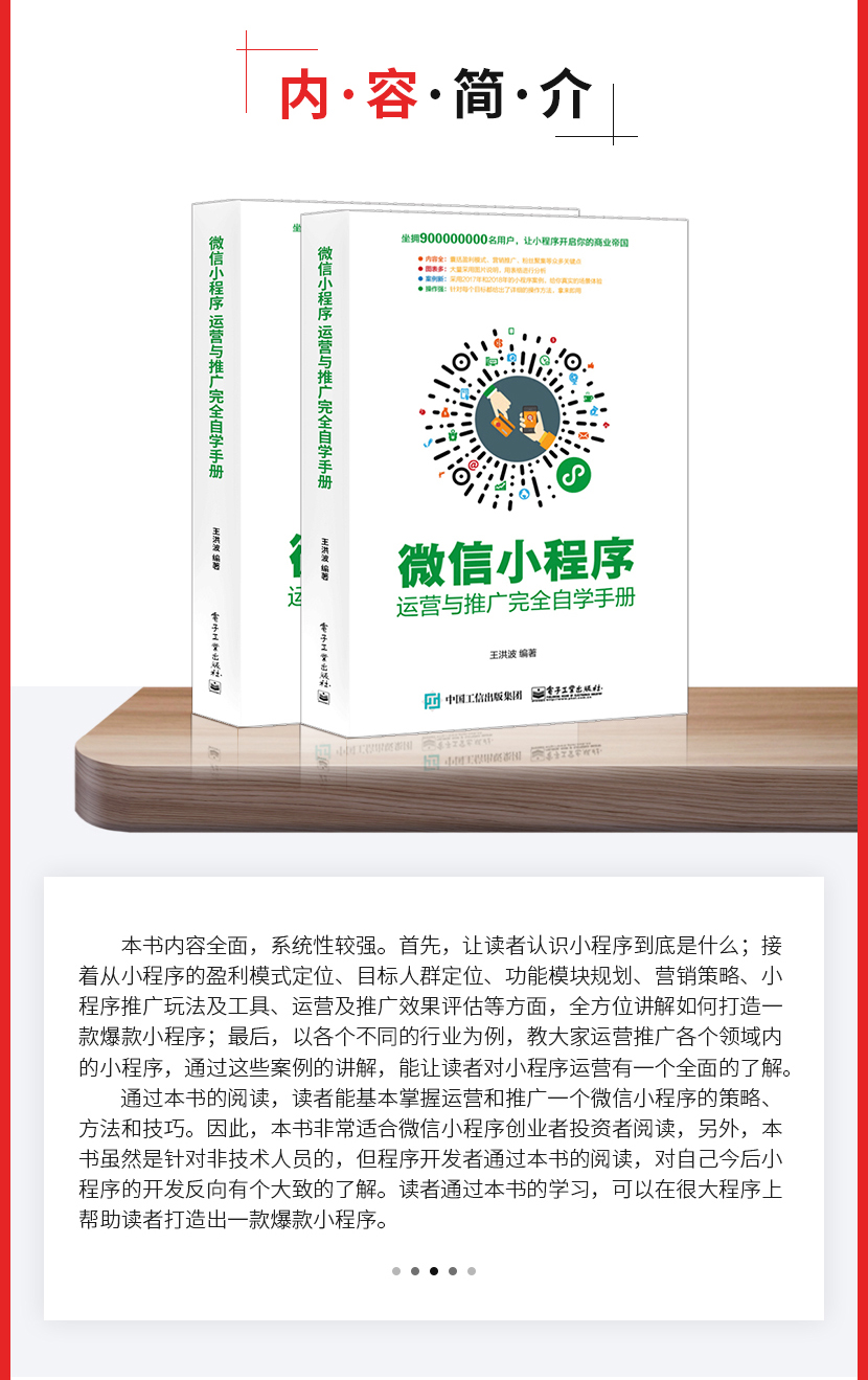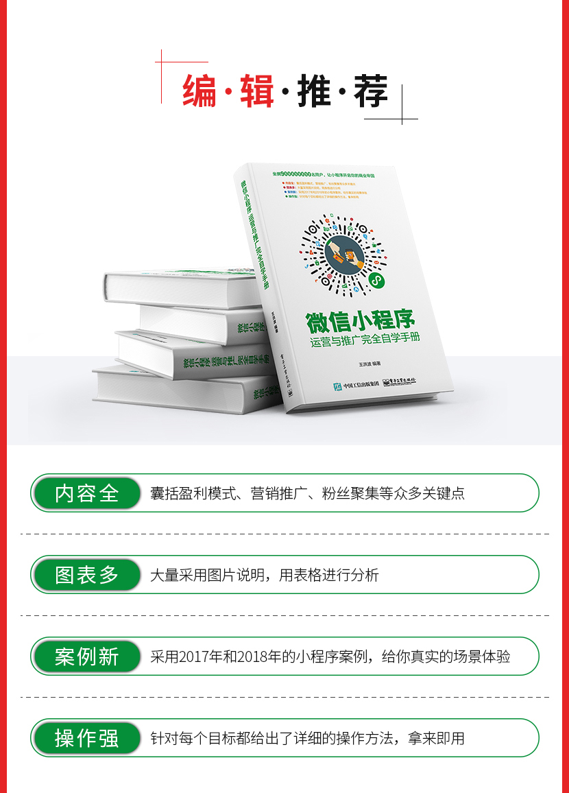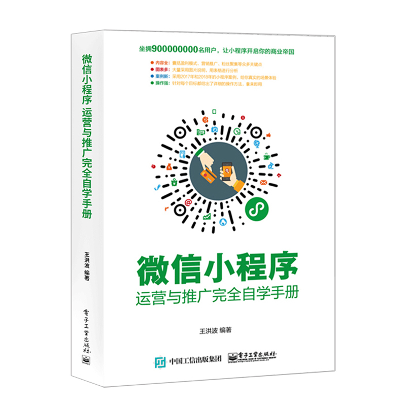 :《微信小程序:运营与推广完全自学手册》让读者认识小程序到底是什么;接着从小程序的盈利模式定位、目标人群定位、功能模块规划、营销策略、小程序推广玩法及工具、运营及推广效果评估等方面。