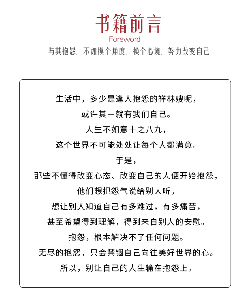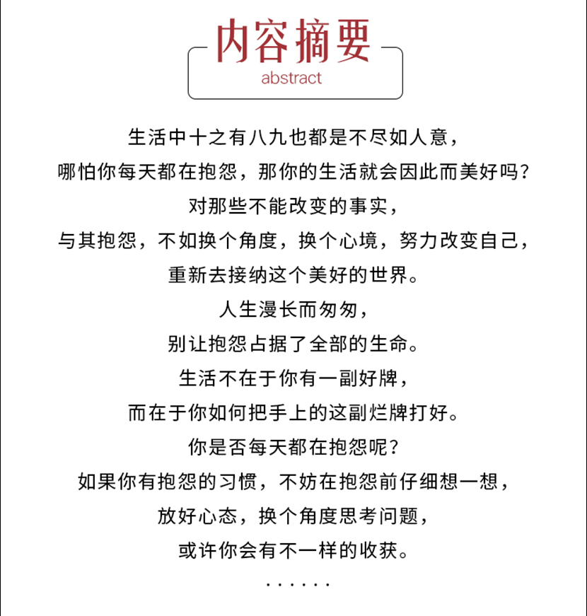 《别输在抱怨上》人们遇到困难和挫折之后不要怨天尤人、怨声载道,而要多反思自己,怀着感恩的心态,换个角度看问题,世界将会很不一样。