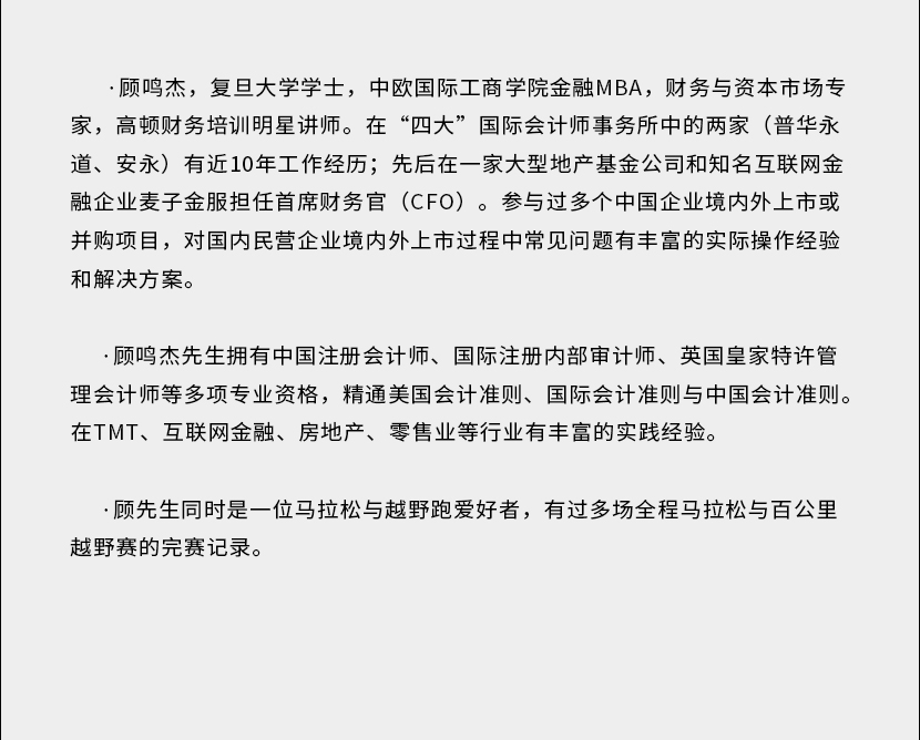 复旦大学学士毕业,中欧国际工商学院金融MBA毕业,财务与资本市场专家,高顿财务培训明星讲师。