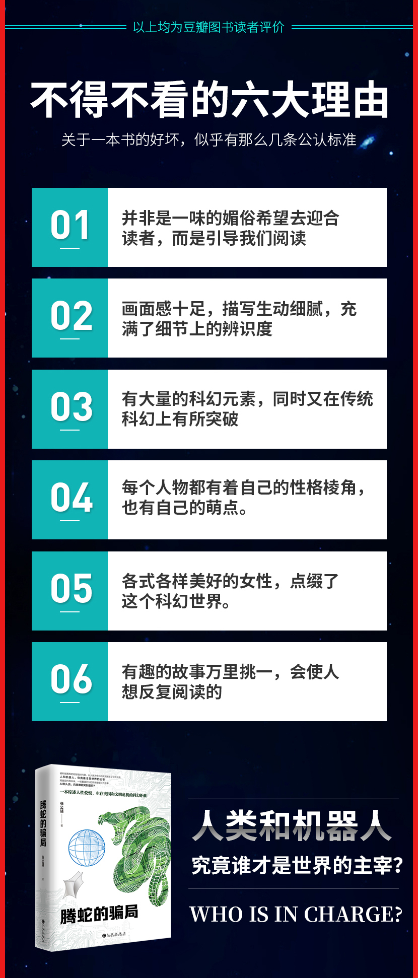 《腾蛇的骗局》(上册)大陆版 九州出版社——被科技圈养后的智能时代里,以人类为中心的文明发生了巨大异变,人和机器人,究竟谁才是世界的主宰,AI和人类,究竟谁能笑到最后
