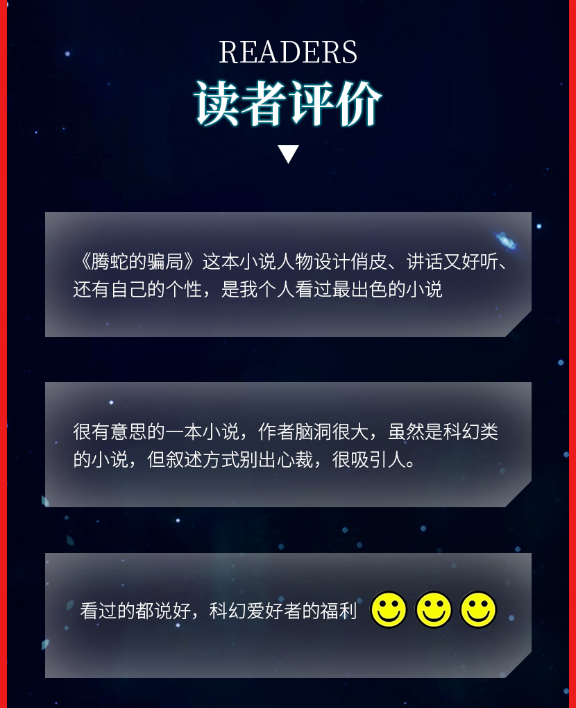 到目前为止,人类的脚步还停留在月球上,其他星球能去的都是探测器,而且是规模很小尝试性的,但在《星际大战》等科幻小说中,人类参与宇宙中的争斗,已经是一个司空见惯的话题。在作家张公辅的科幻小说《腾蛇的骗局 (展开/收缩)