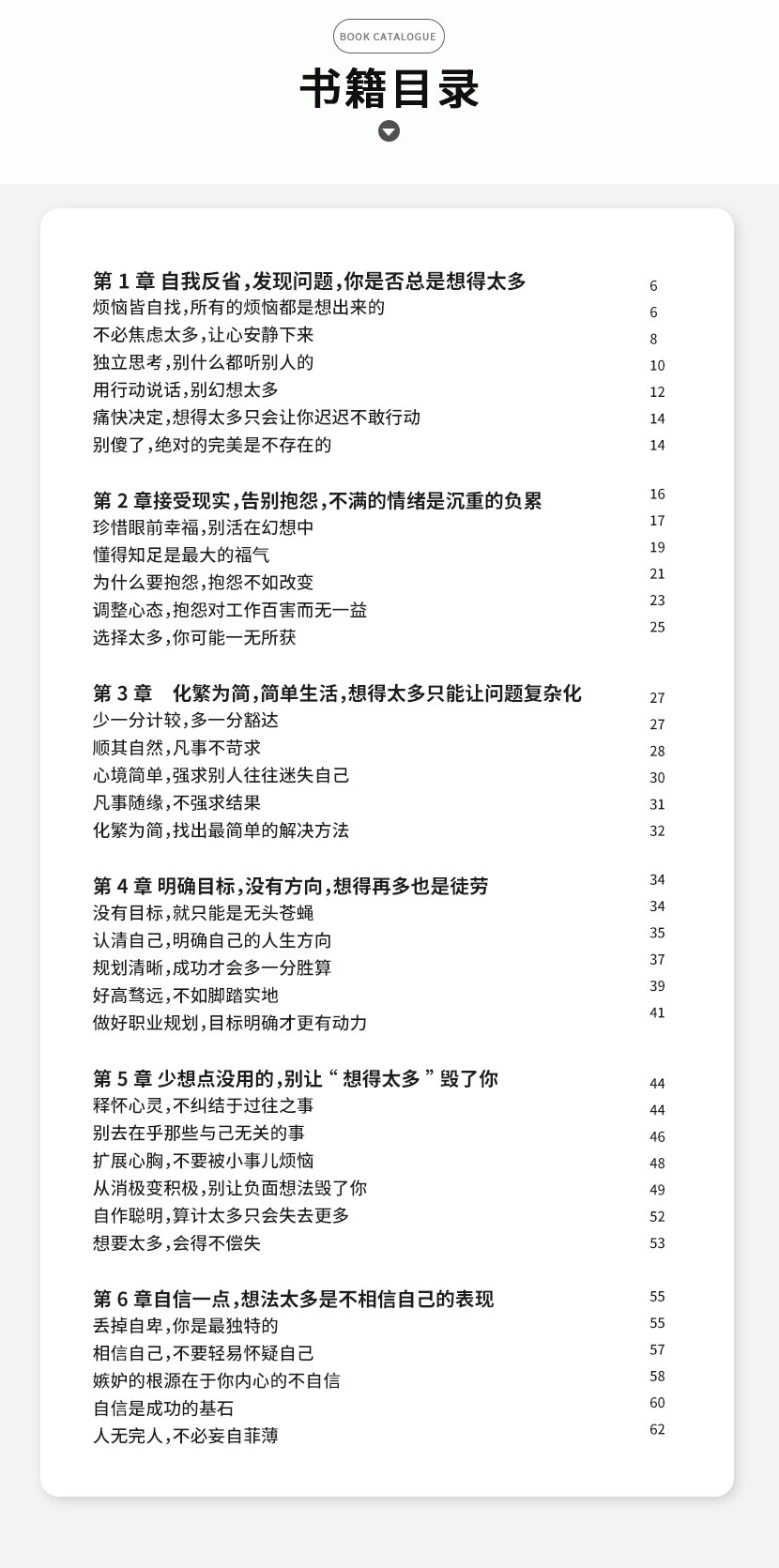 《静下心来,发现自己》克服负面情绪、放下心灵包袱的秘诀和方法,而其中的关键就在于不要想得太多,凡事不多想,你就能获得简单心境,就能获得轻松快乐的生活。