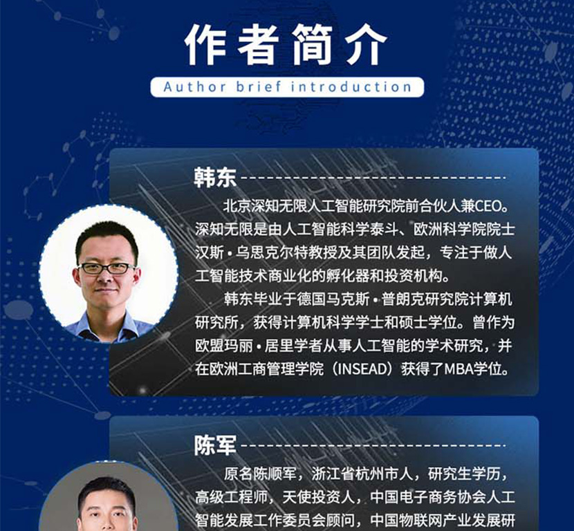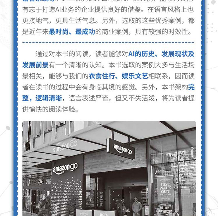 陈顺军:《人工智能:商业化落地实战》人工智能的发展已经成为趋势,亚逊的Echo智能音箱、IBM的智能医疗、谷歌的无人驾驶、百度的度秘智能语音系统等。这些的AI公司及AI产品案例,能够为其他有志于打造AI业务的企业提供良好的借鉴。