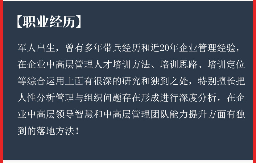 决策中国专家智库客座教授;北大元培工匠高级智库专家;国家注册高级培训师、咨询师;北大EMBA高级研修班特聘讲师;湖北广播电视台特聘创新创业导师;武汉国民企业与市场经济研究院执行院长;