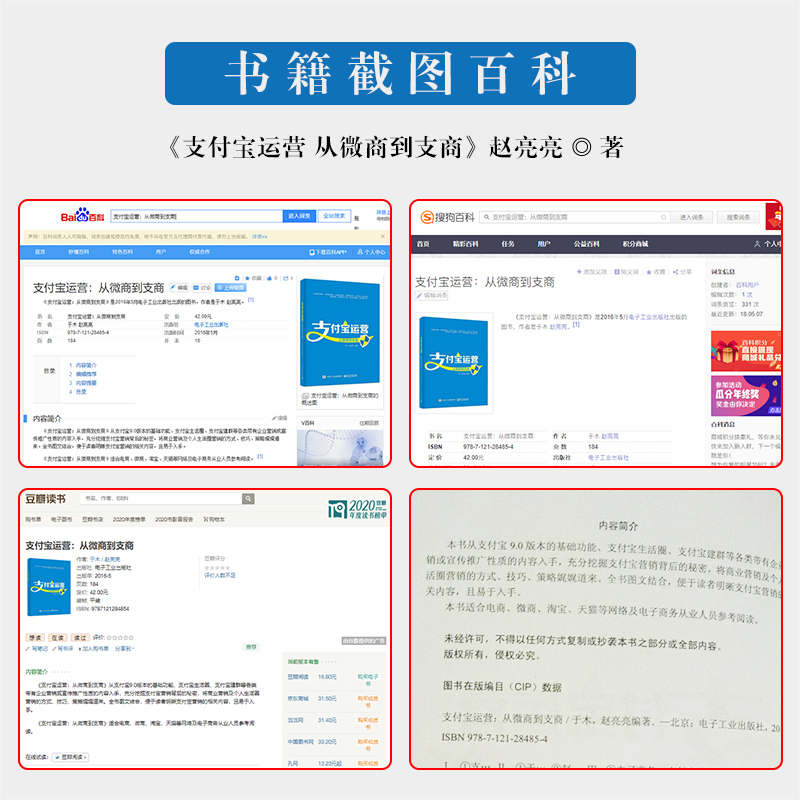 赵亮亮:《支付宝运营 从微商到支商》:本书从支付宝9.0版本的基础功能、支付宝生活圈、支付宝建群等各类带有企业营销或宣传推广性质的内容入手,充分挖掘支付宝营销背后的秘密,将商业营销及个人生活圈营销的方式、技巧、策略娓娓道来。全书图文结合,便于读者明晰支付宝营销的相关内容,且易于入手。