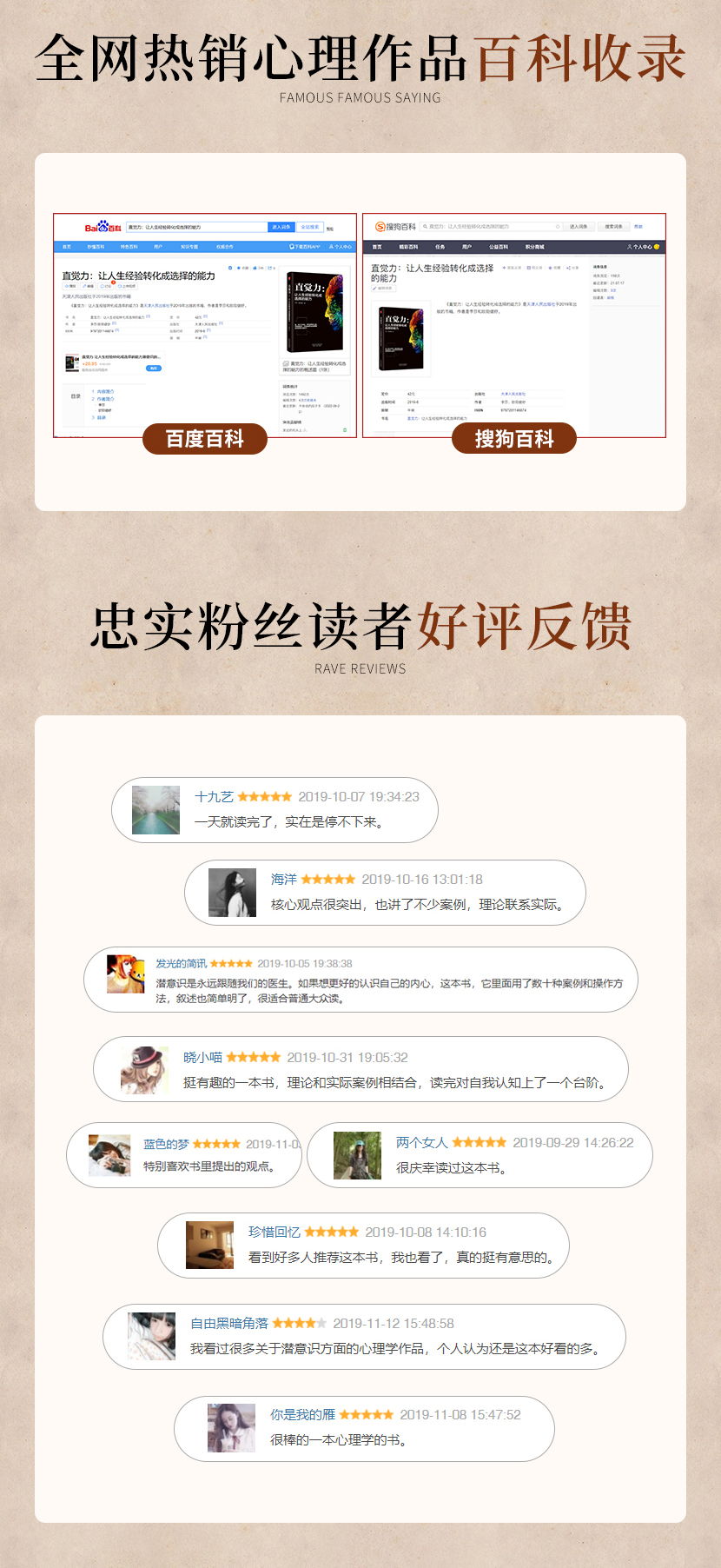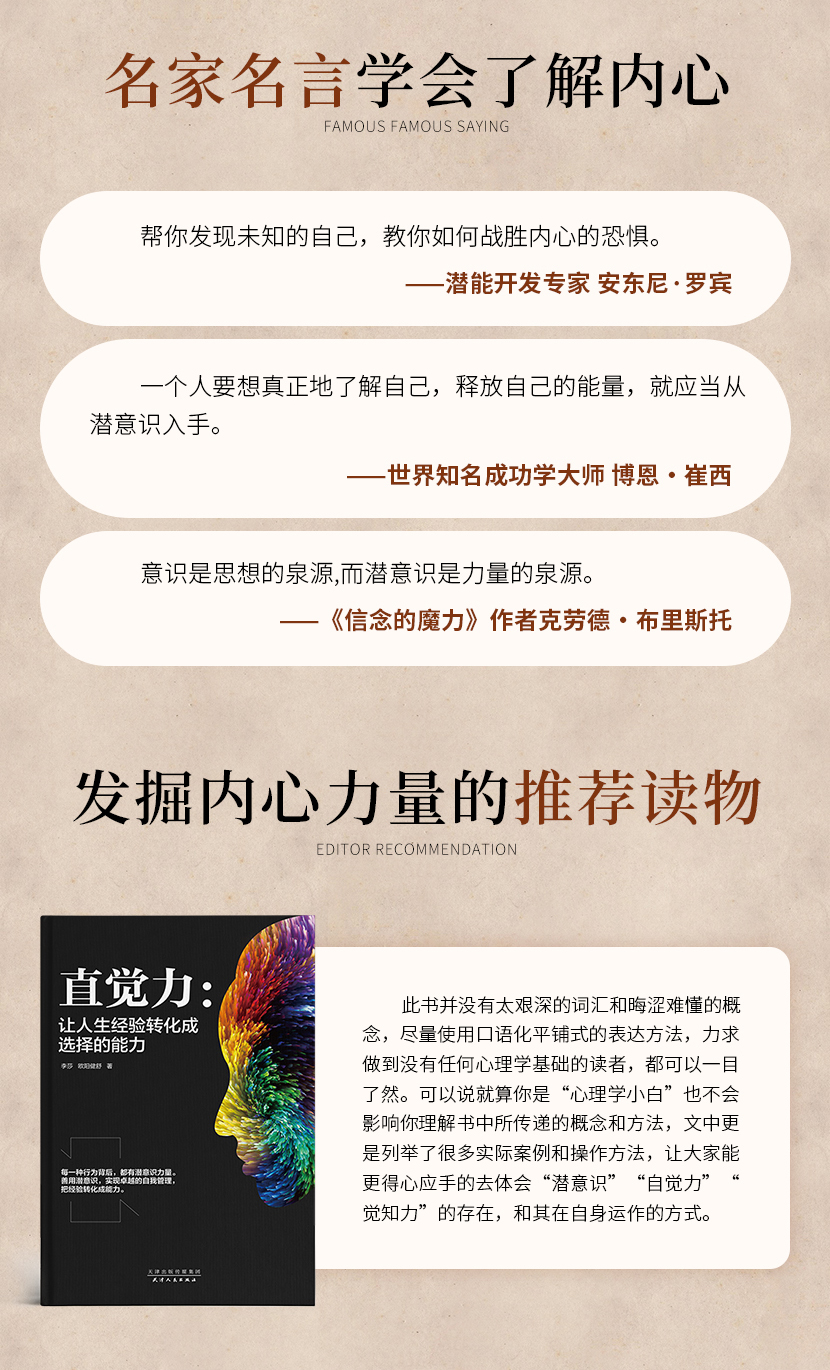 侯健飞:《直觉力:让人生经验转化成选择的能力》本书以心理学中“潜意识”的相关理论为基础,首创“直觉力”概念。运用心理学理论剖析日常生活中的现象,阐释其内在机制及人们行为背后的心理逻辑。