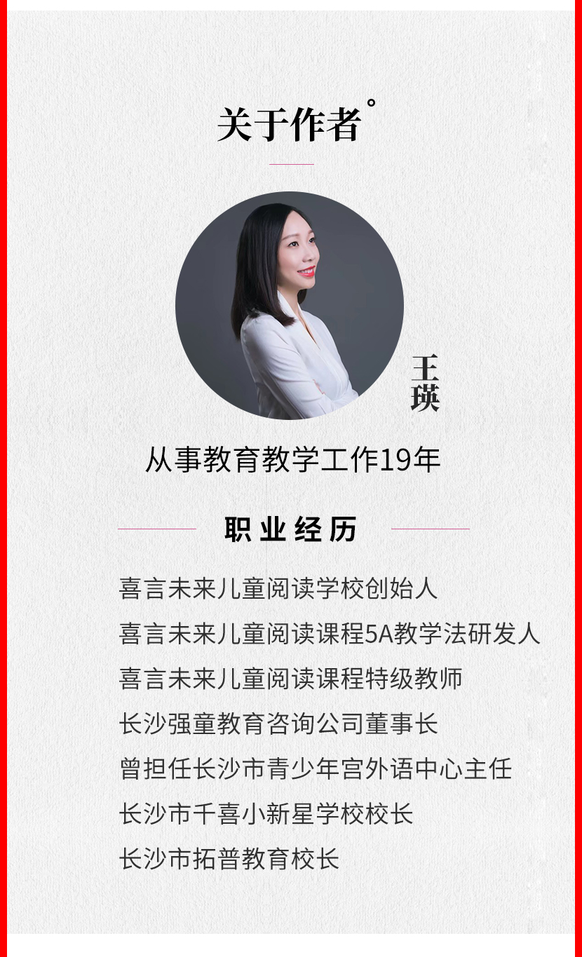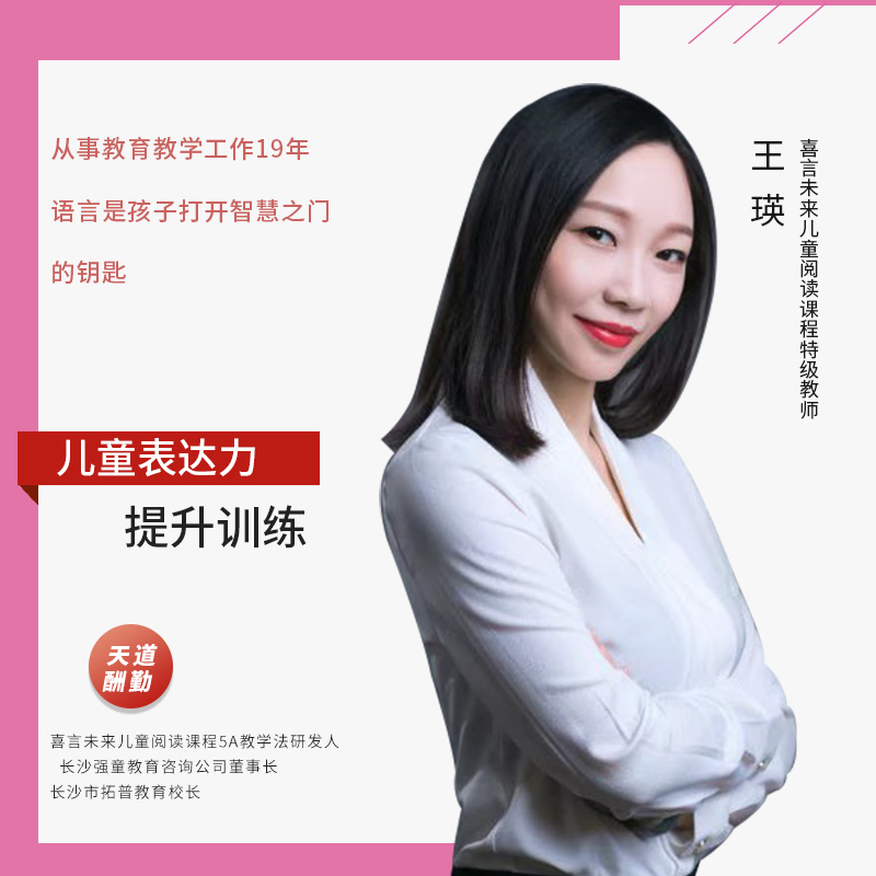 儿童表达力提升训练喜言未来儿童阅读学校创始人; 喜言未来儿童阅读课程5A教学法研发人; 喜言未来儿童阅读课程特级教师; 长沙强童教育咨询公司董事长;
