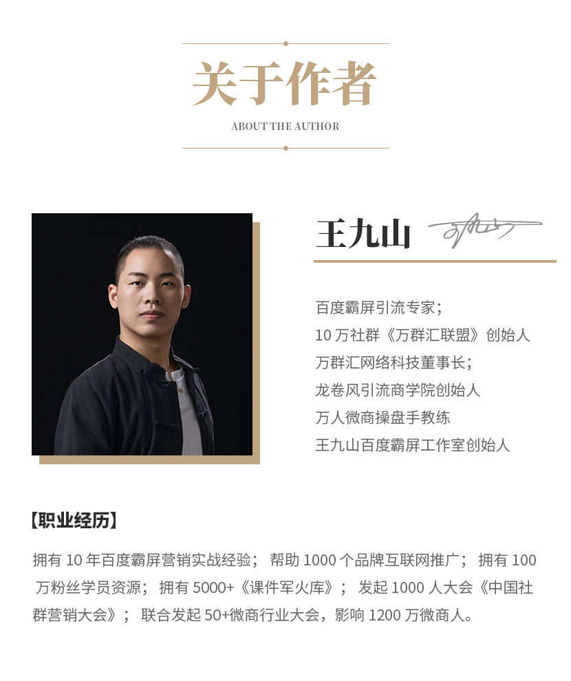 畅销书作家/资深媒体人; 中国实战派网络营销专家;王九山网络霸屏工作室创始人。