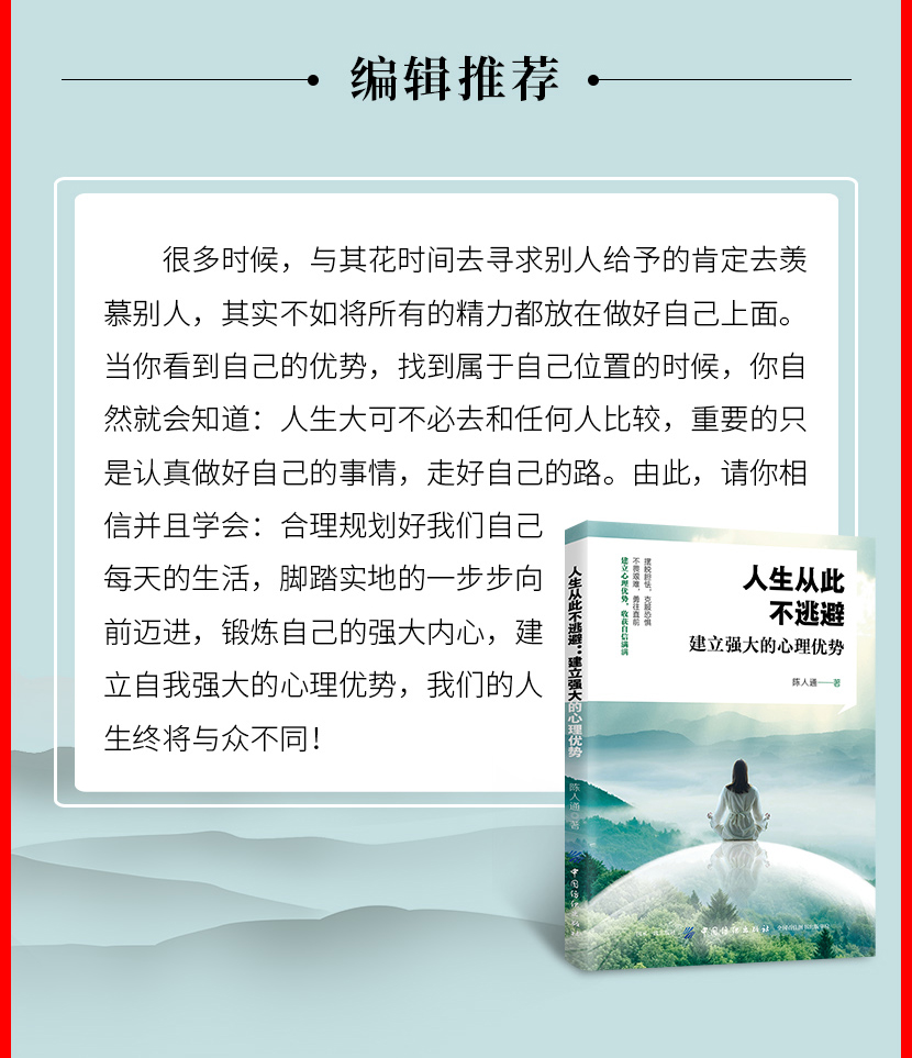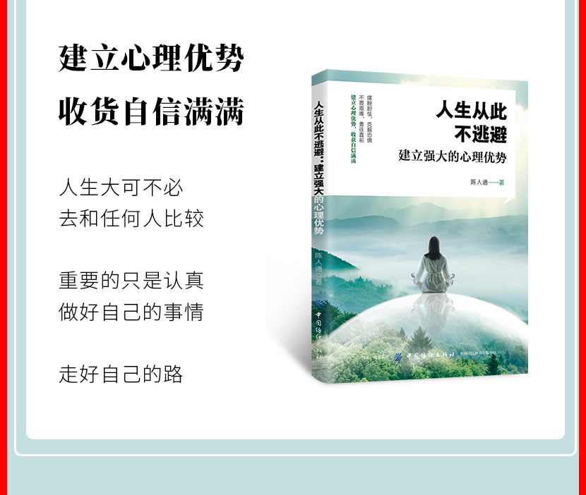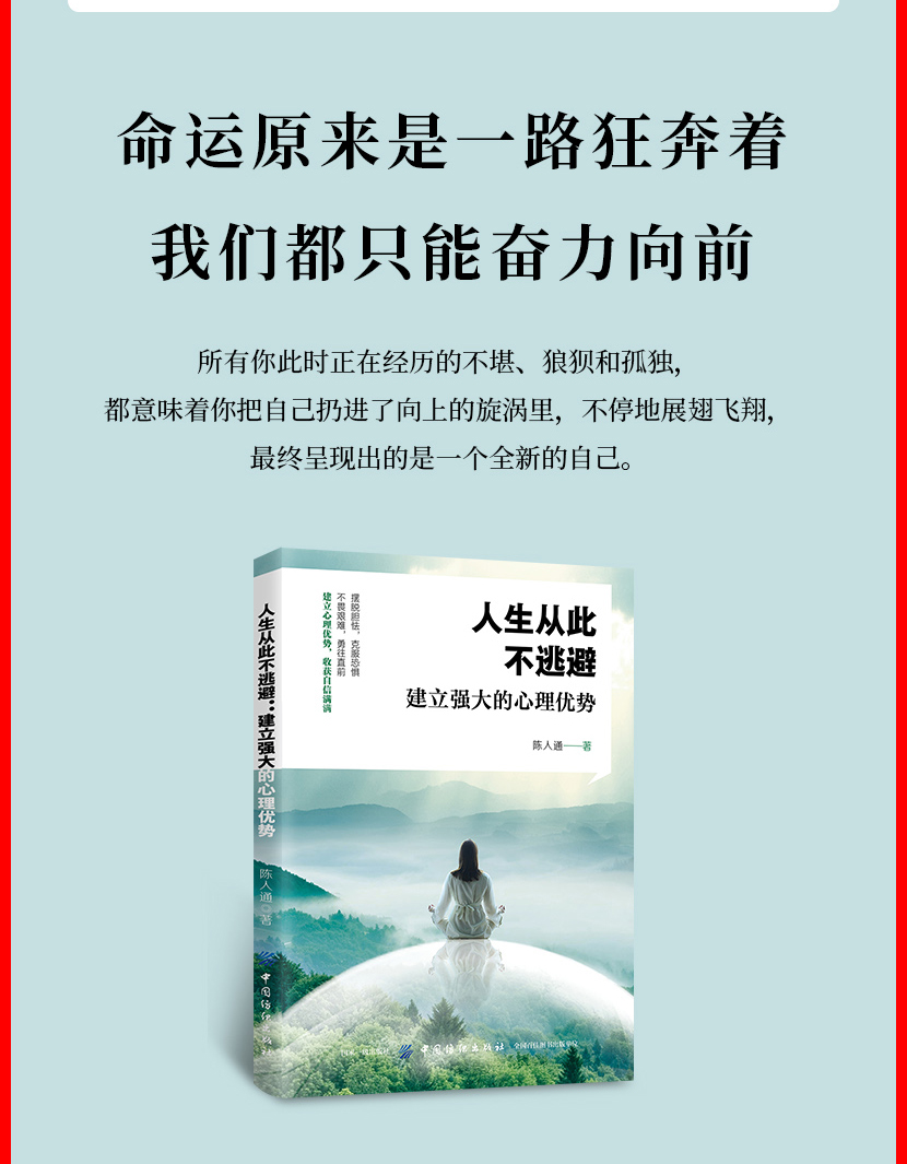 陈人通:《人生从此不逃避:建立强大的心理优势》人生之旅,活着并不容易,所以我们忙着不断追求物质利益的时候,不要忘了停下匆匆的脚步,抽出时间修心,不要让这烦琐芜杂的生活堵住我们的心灵之泉。