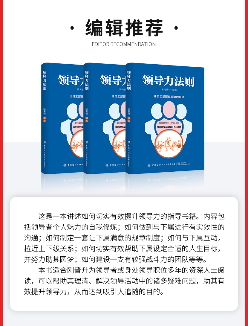 陆禹萌:《领导力法则》本书从的日常管理工作开始,为您阐述了管理学的一些基本原理,并结合各种实例,教会如何将这些技巧巧妙运用到管理中,帮助高效地带领团队。