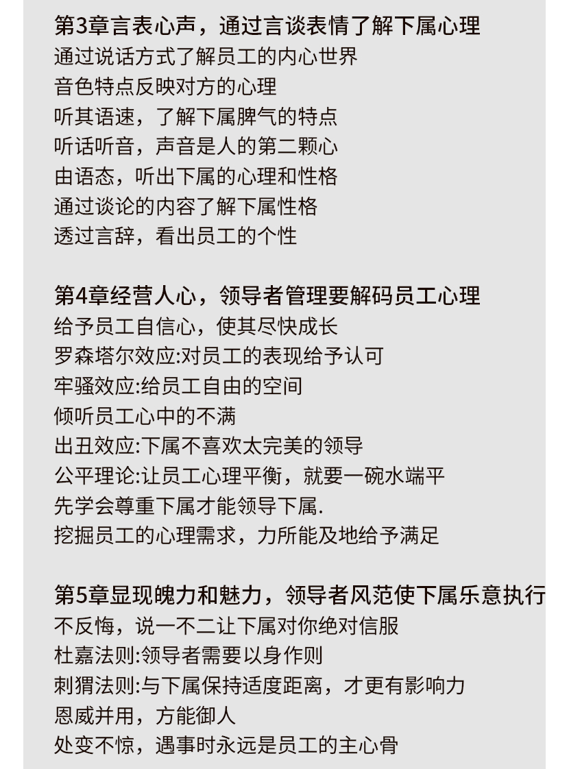 《管理三要:识人、管人、用人》给与员工自信心,使其尽快成长,给员工自由的空间,倾听员工心中的不满,让员工心里平衡,挖掘员工的心理需求,力所能及地给与满足。