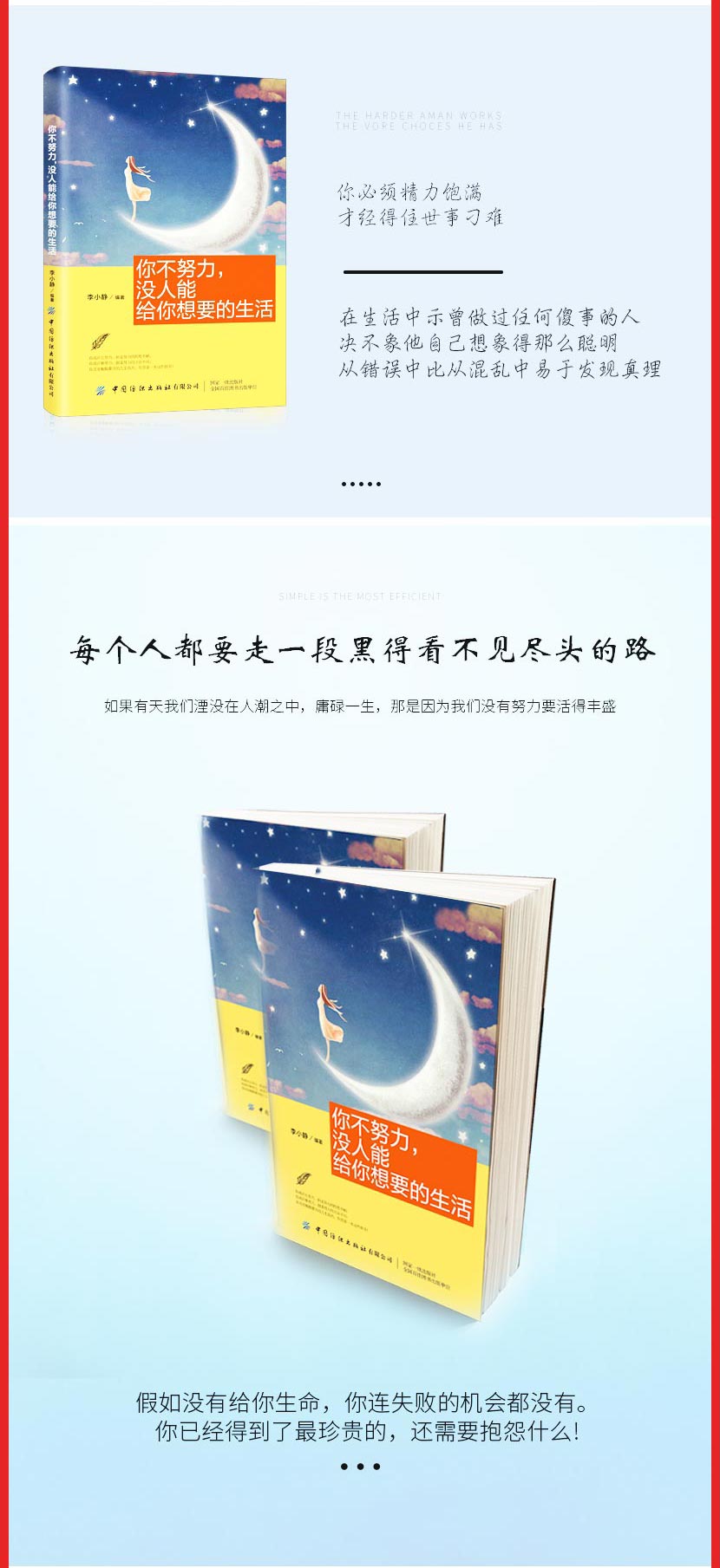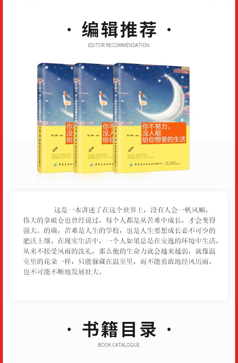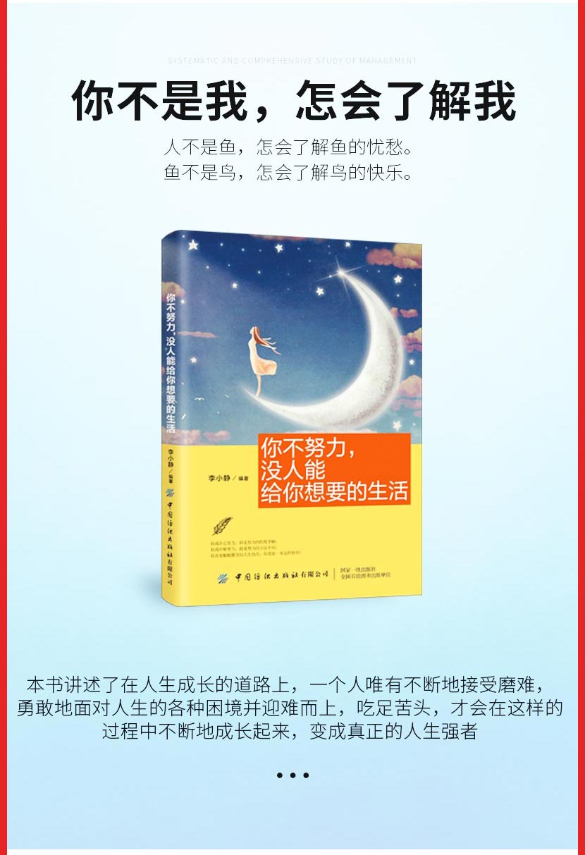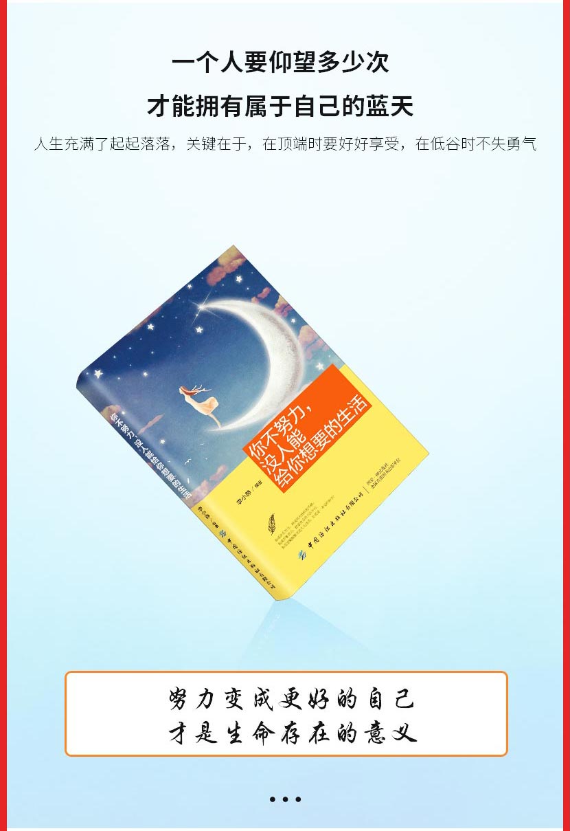 《你不努力,没有人能给你想要的生活》通过流畅优美的语言、暖心励志的故事,相信可以教给读者如何面对人生的坎坷,保有乐观的心态,守住自己的坚持。