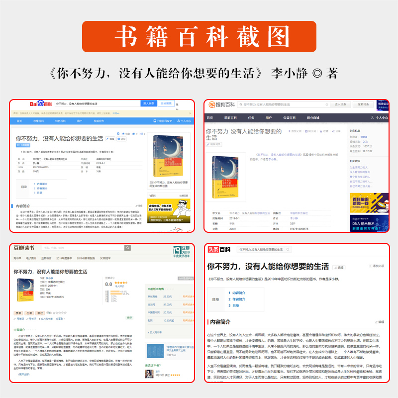 李小静:《你不努力,没有人能给你想要的生活》通过流畅优美的语言、暖心励志的故事,相信可以教给读者如何面对人生的坎坷,保有乐观的心态,守住自己的坚持。