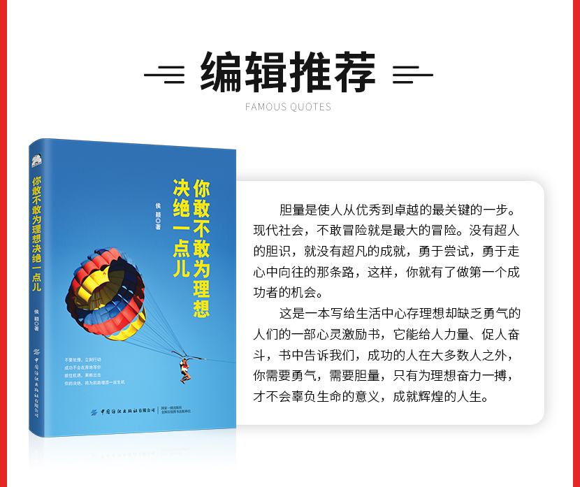 侯颖:《你敢不敢为理想决绝一点儿》本书只想告诉读者一点生活的真相:所有的理想,都起自于妄想;所有的美好,都经历过不堪;所有的得到,都开始于去做。