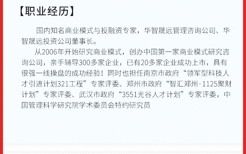 华智晟远(北京)管理咨询有限公司董事长;国家科技部专家库专家评委;国家工信部全国领军人才项目授课专家;创业黑马(股票代码:300688)模式融合模块导师。