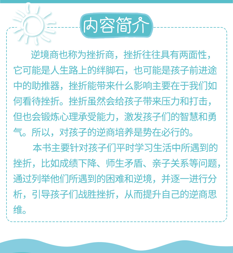 《儿童逆商培养课》——帮助孩子脚踏挫折步入人生高峰适度摩擦走出生活困境,书中包含了高自我效能感培养+正确归因训练t积极应对建议+反思技巧指导。