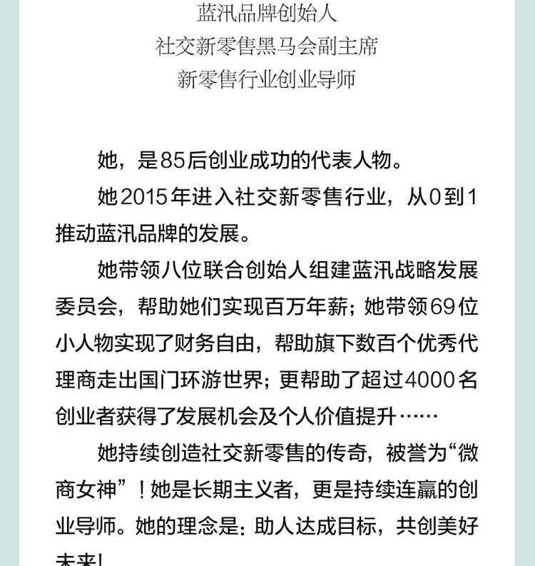 蓝汛品牌创始人,蓝汛战略发展委员会主席,社交新零售黑马会副主席,新零售行业最具投资价值创业导师;