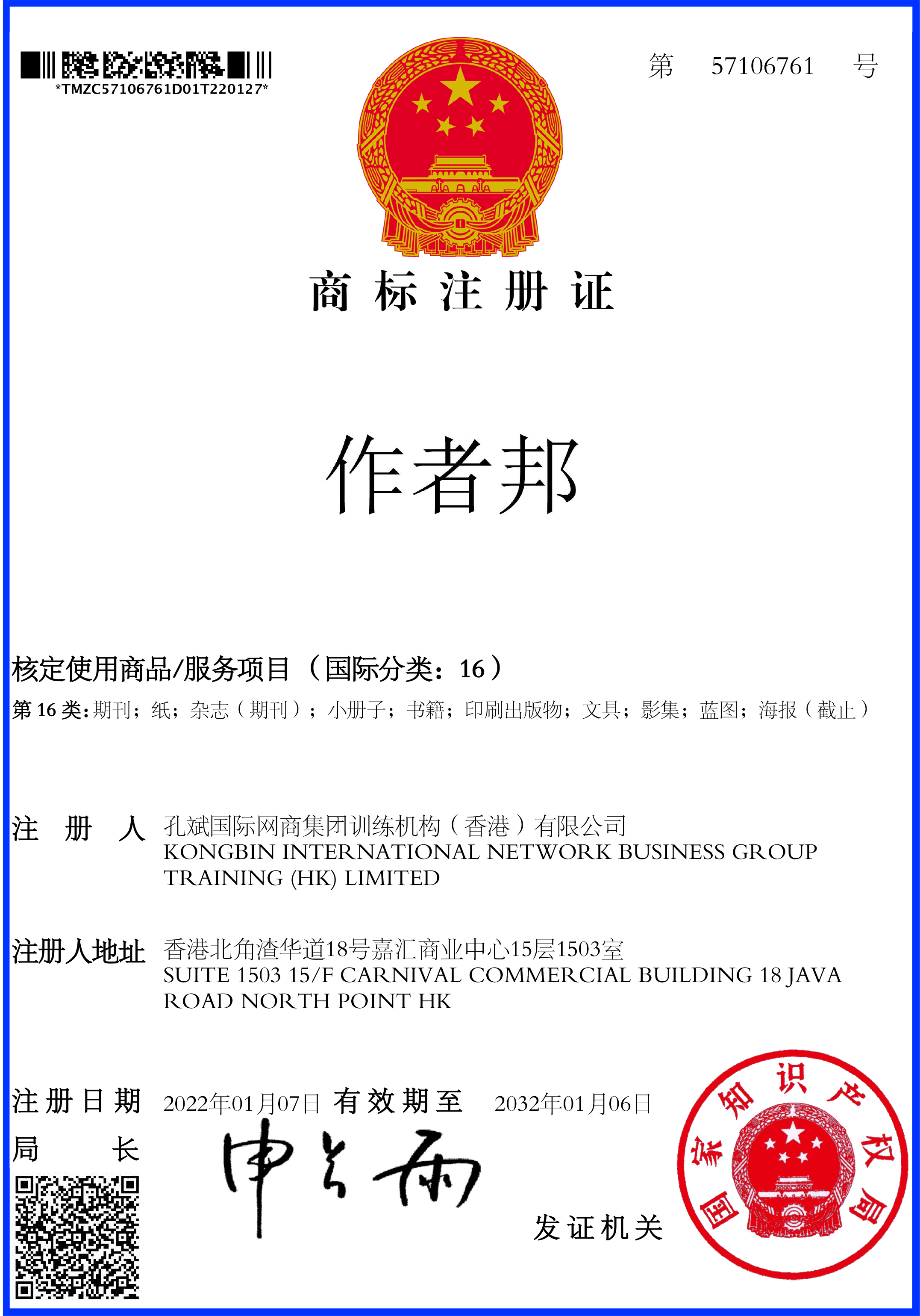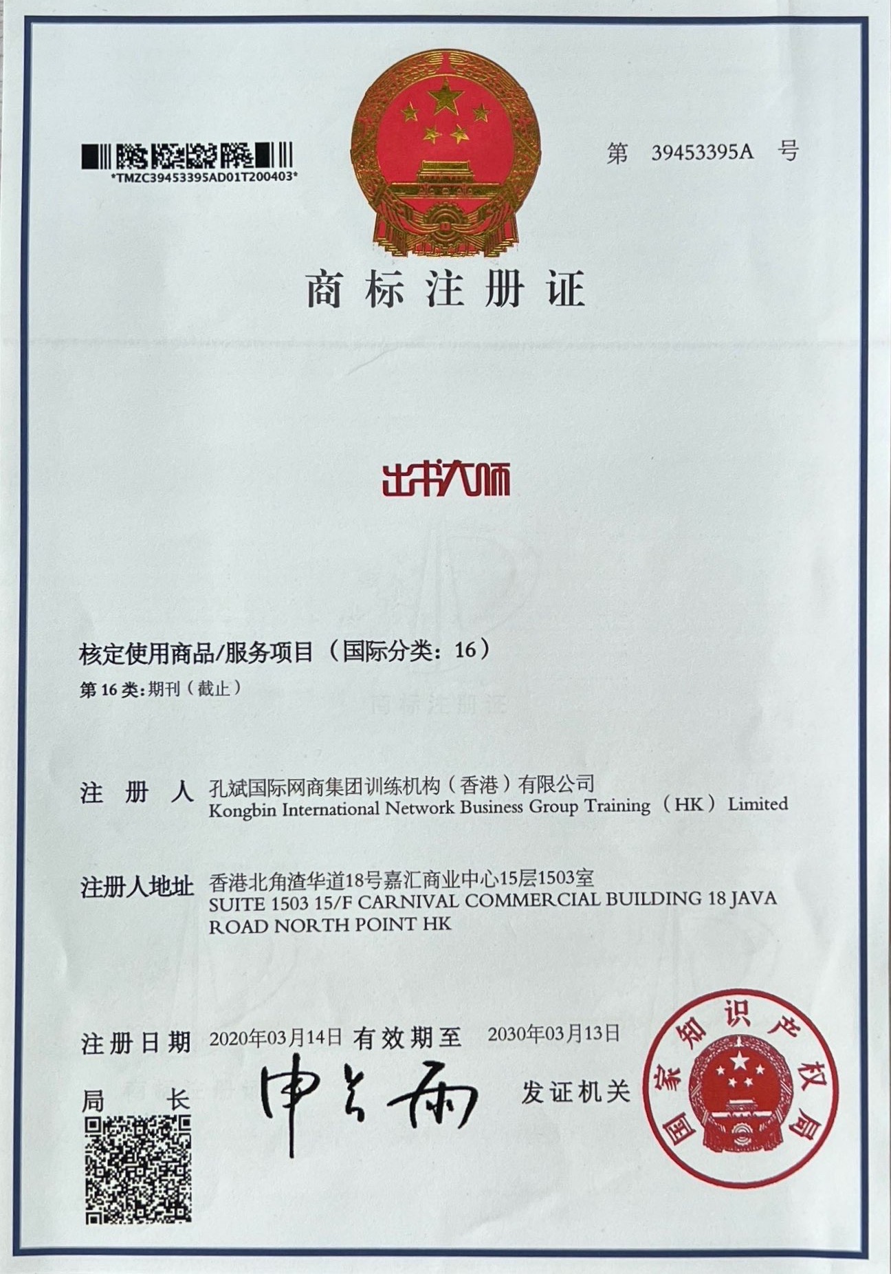 孔斌:出书大师商标注册证书:核定使用商品/服务项目(国际分类:16)