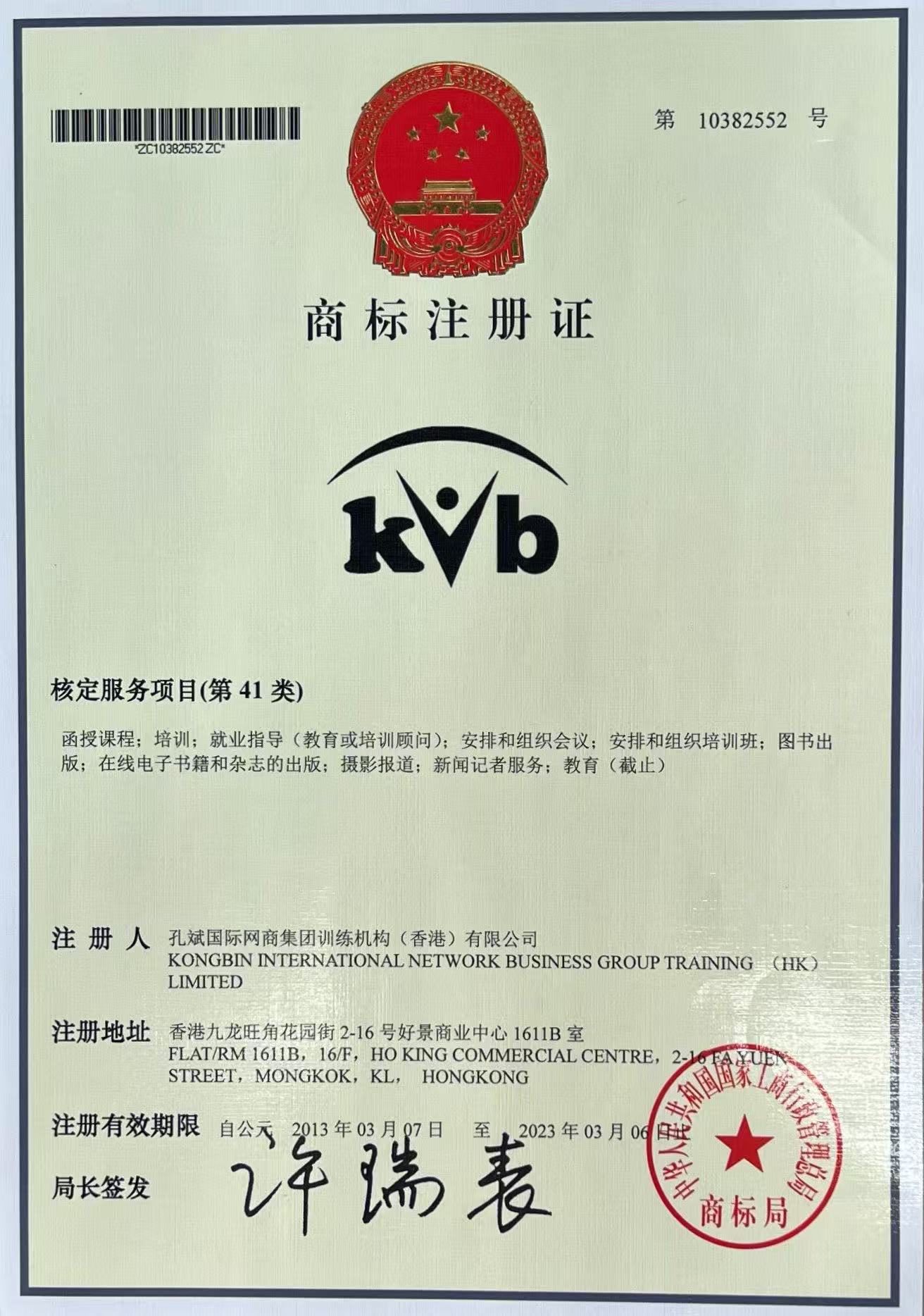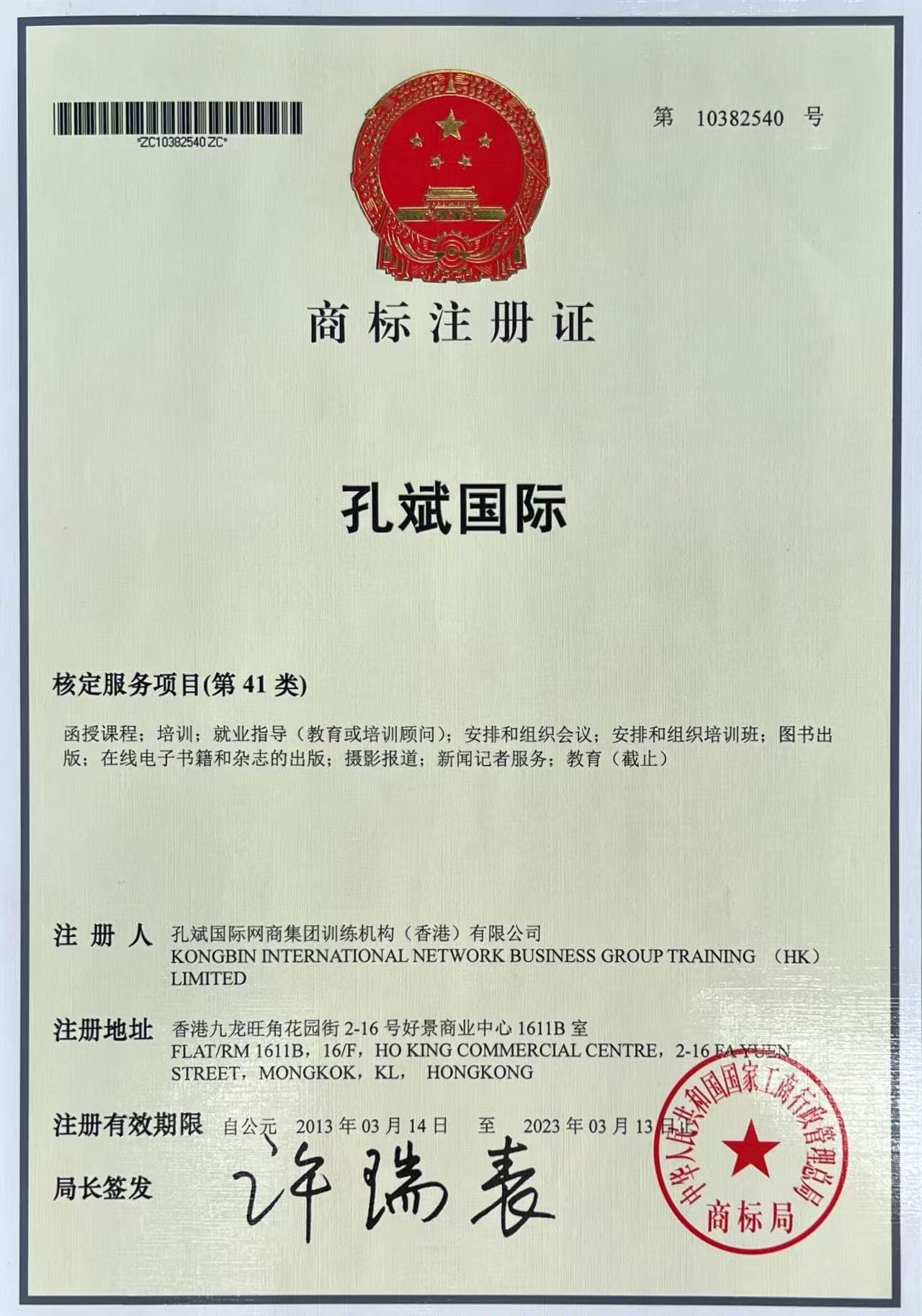 孔斌:孔斌国际商标注册证书:核定服务项目(41类)