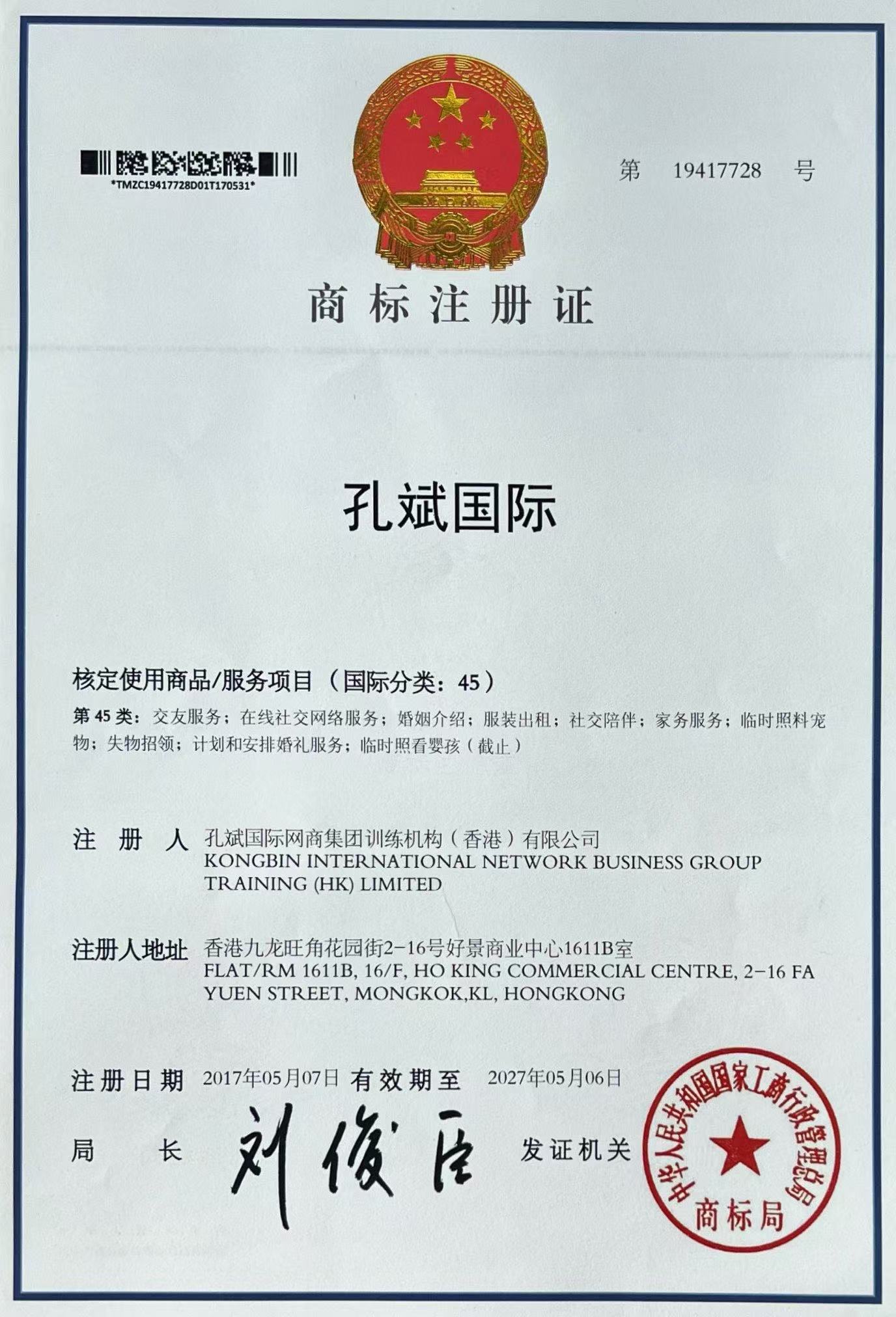 孔斌:孔斌国际商标注册证书:核定使用商品/服务项目(国际分类:45)