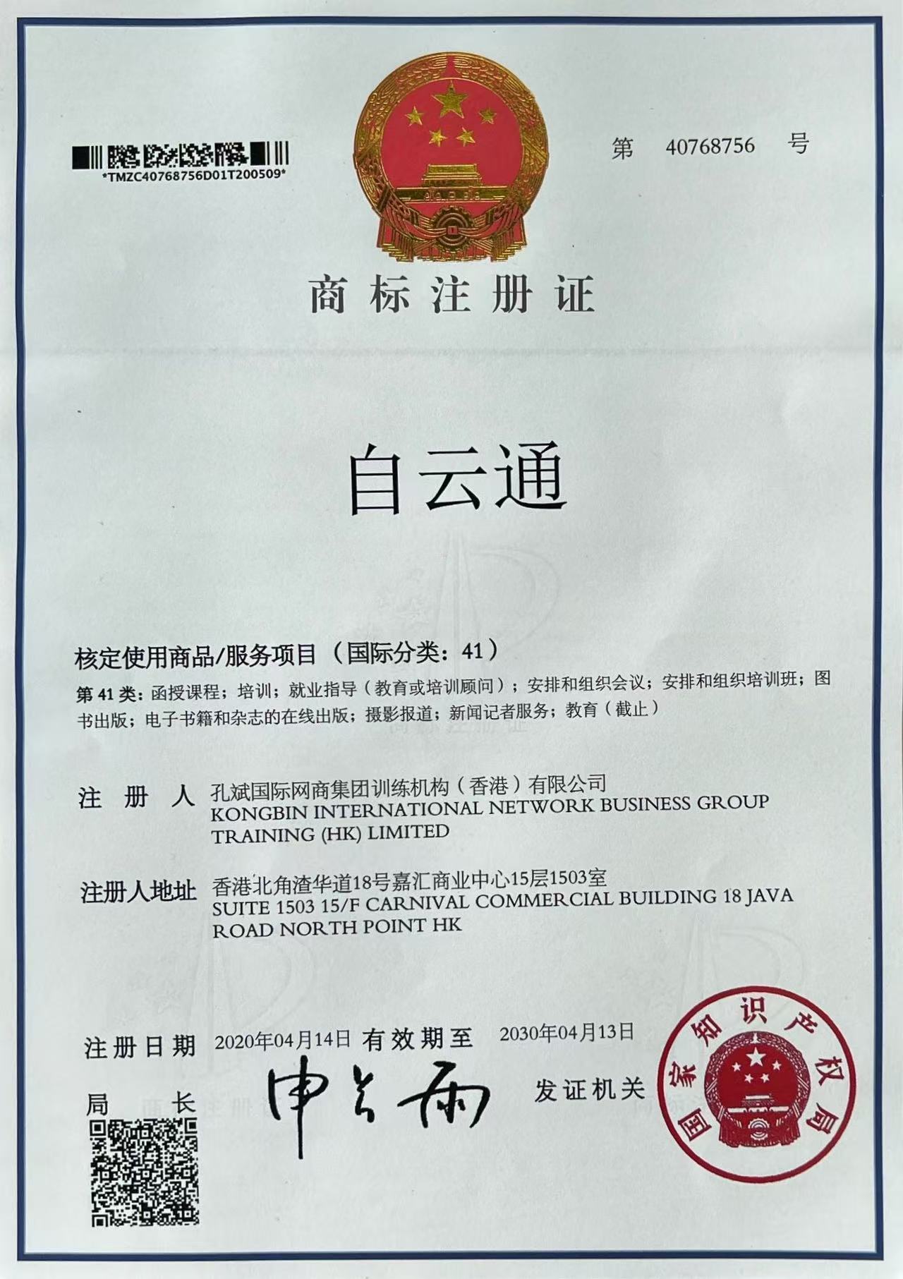 孔斌:自云通商标注册证书:核定使用商品/服务项目(国际分类:41)
