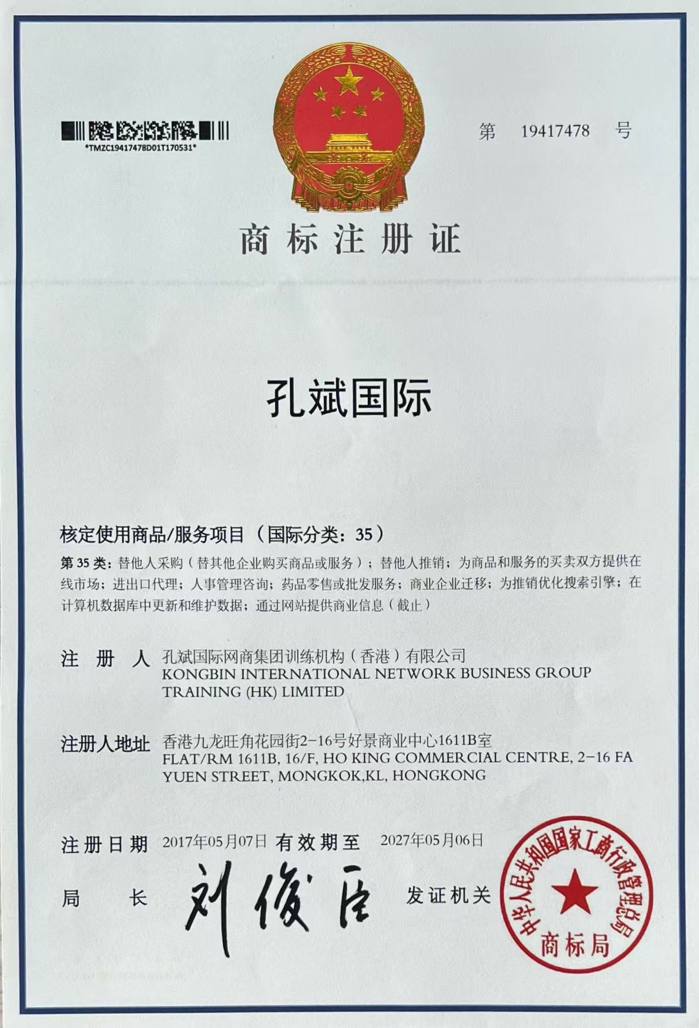 孔斌:孔斌国际商标注册证书:核定使用商品/服务项目(国际分类:53)