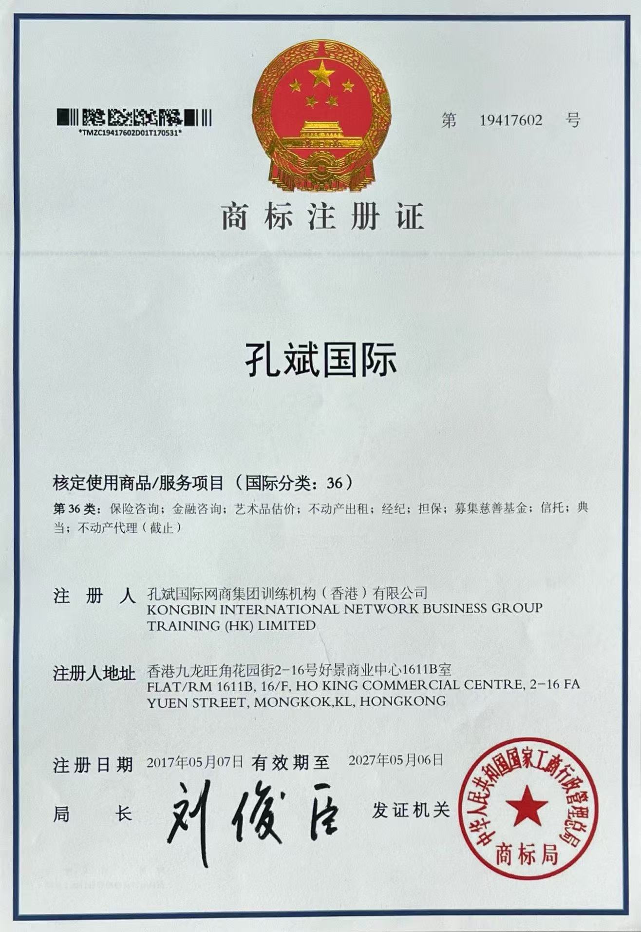 孔斌:孔斌国际商标注册证书:核定使用商品/服务项目(国际分类:36)