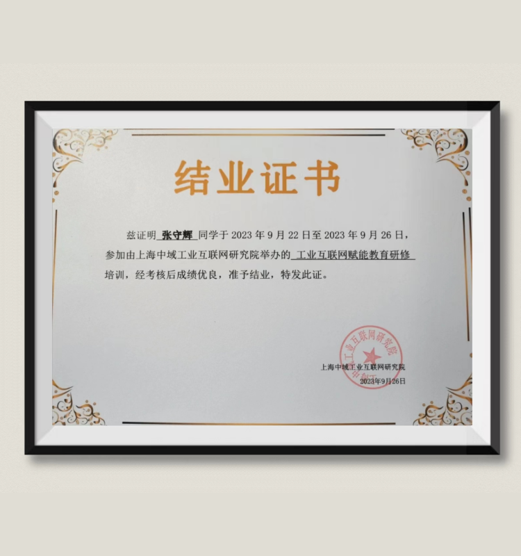 张守辉:荣获——“工业互联网赋能教育研修培训结业证书”