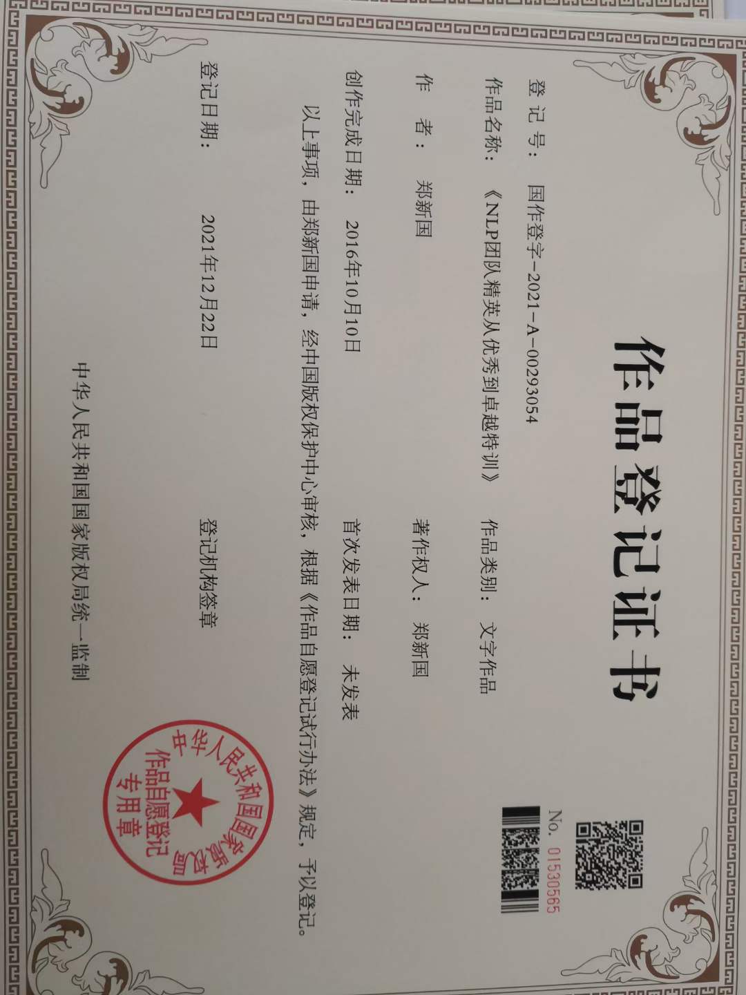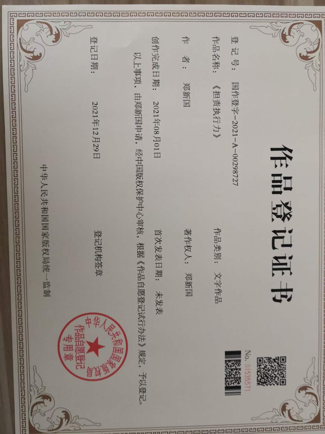 郑时墨:作品登记证书