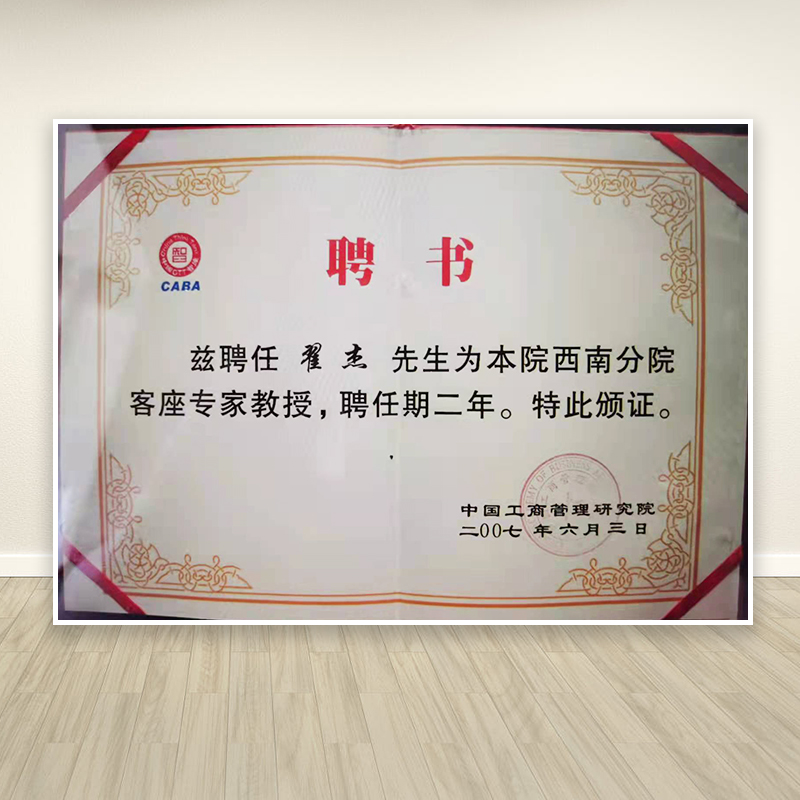 翟杰:中国工商管理研究院西南分院客座专家教授聘书