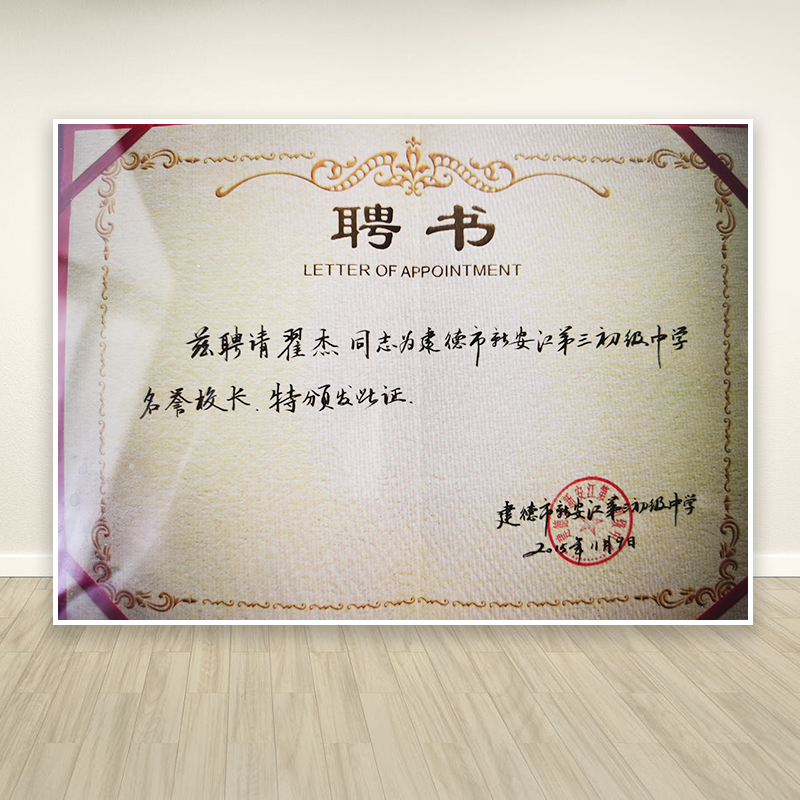 翟杰:建德市新安江第三初级中学名誉校长聘书