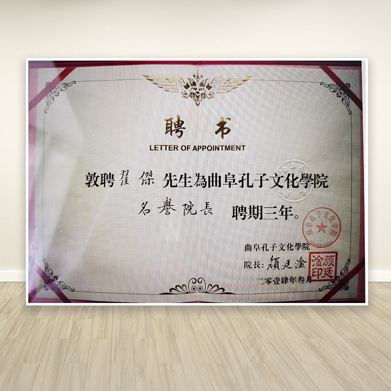 翟杰:曲阜孔子文化学院名誉校长聘书