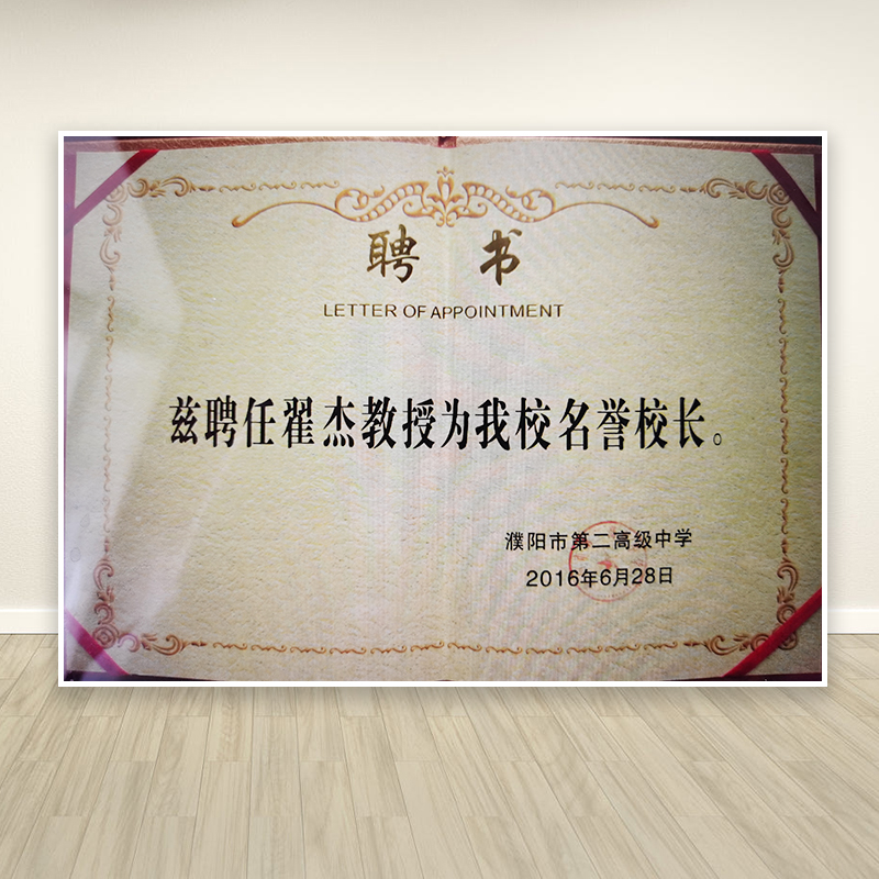翟杰:濮阳市第二高级中学名誉校长聘书