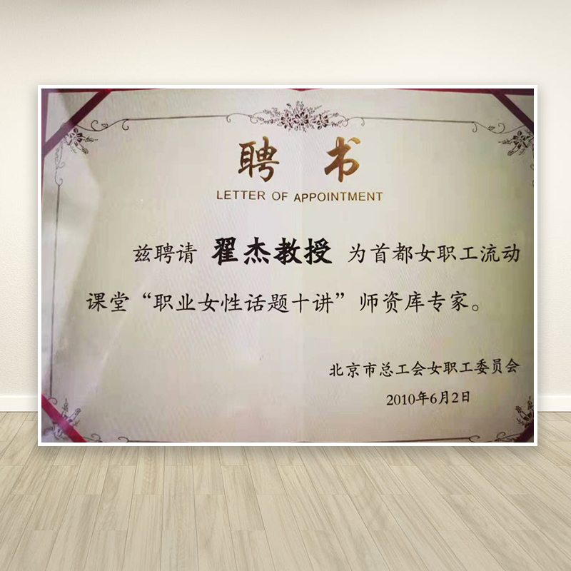 翟杰:首都女职工流动课堂 职业女性话题十讲 师资库专家聘书