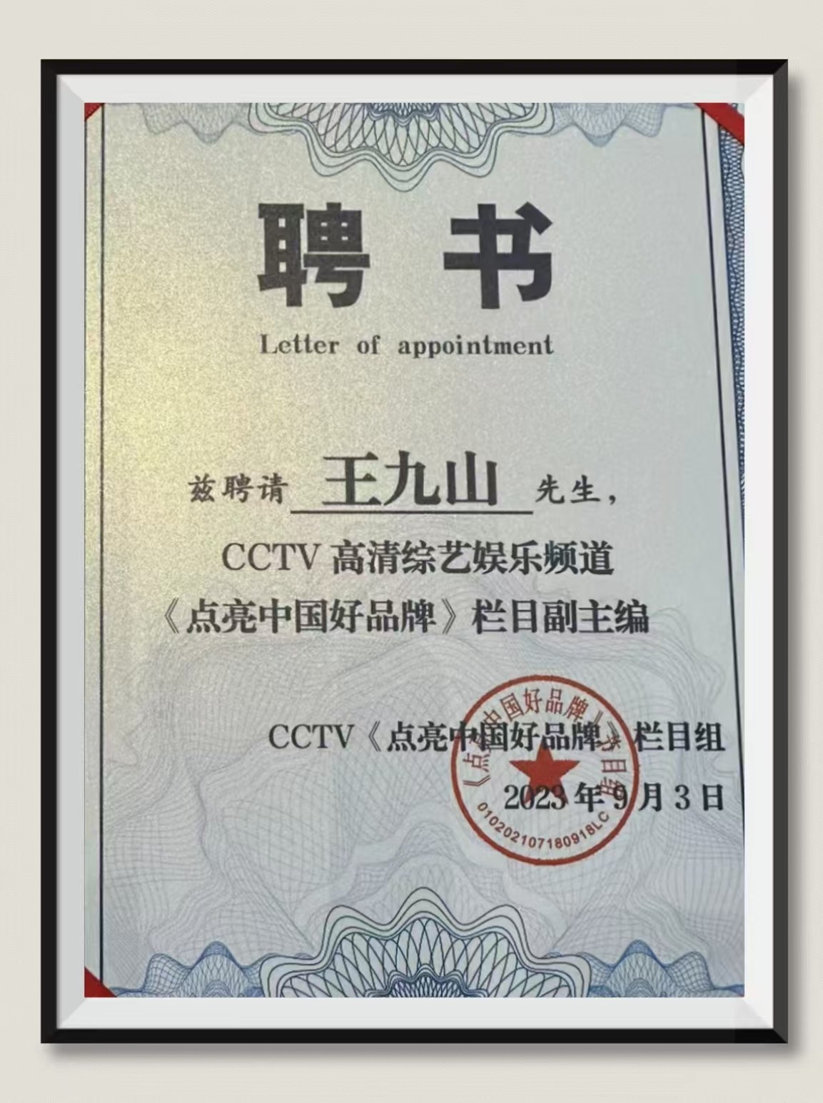 王九山:恭喜王九山老师成为CCTV高清娱乐综艺频道《点亮中国好品牌》栏目副主编
