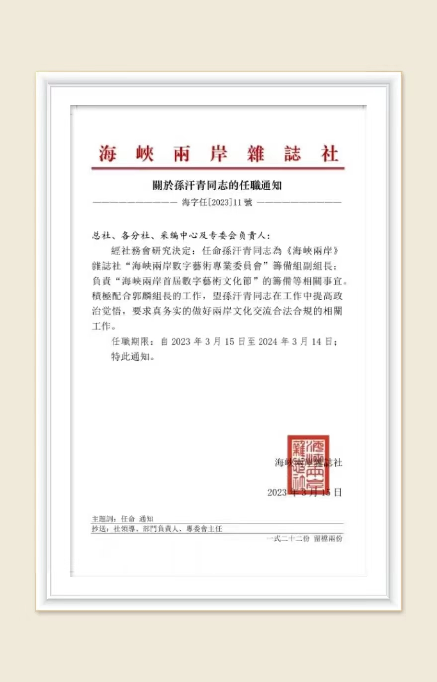 孙汗青:担任“海峡两岸数字艺术专业委员会”筹备组副组长