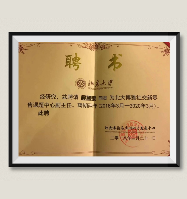 吴智银:受聘为——北大博雅社交新零售课题中心副主任