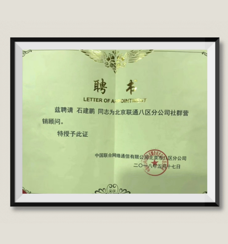石建鹏:受聘为——“北京联通八区分公司社群营销顾问”
